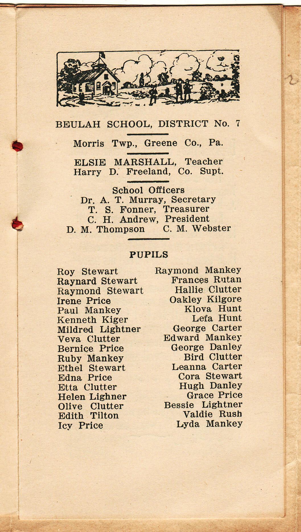 Source Citation: Souvenir program presented by Elsie Marshall, Teacher - Beulah School, District No. 7, Morris Township, Greene County, Pennsylvania; printed by Ohio Ptg. Co., N. Phila., O., dated 1919; item no. SUPL-AN007-0003, School Series, Wayne Carl Swart Collection, Greene Connections Archives Project (www.GreeneConnections.com).