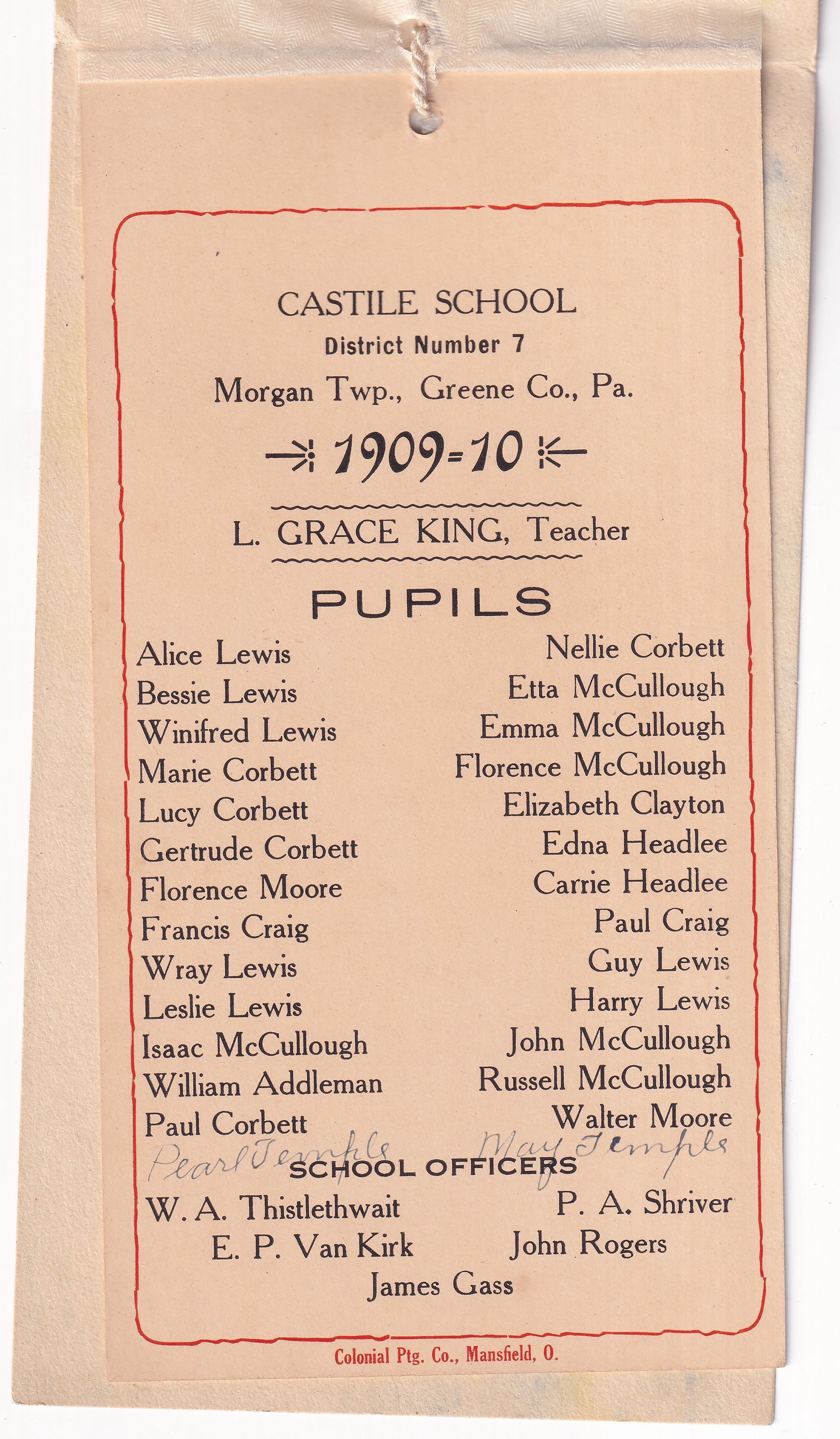 Dated 1909-1910. Souvenir program presented by L. Grace King, Teacher - Castile School, District Number 7, Morgan Township, Greene County, Pennsylvania.