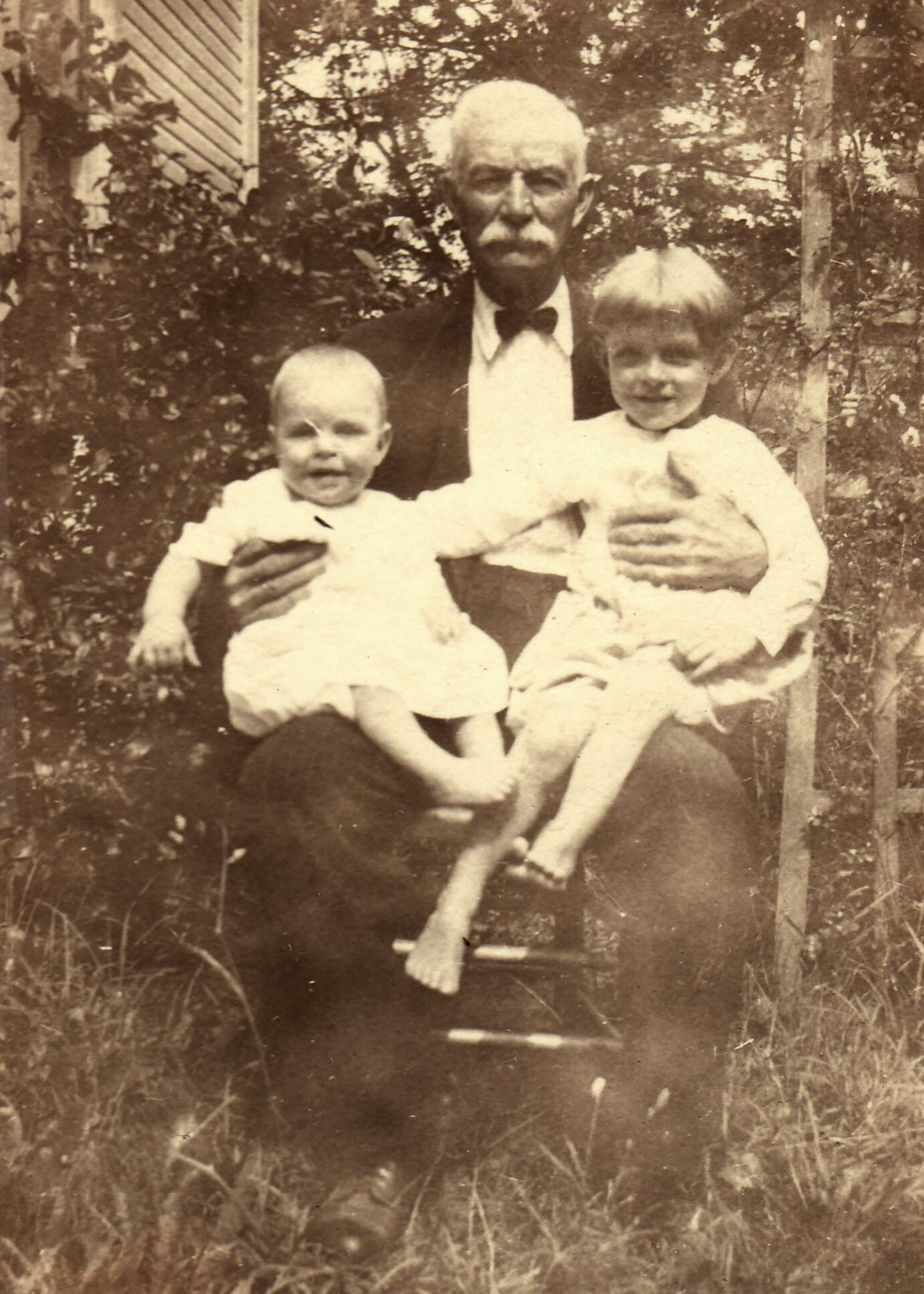 SOURCE CITATION: Spencer B. Rose [1849-1931] holding his grandsons [Left-Right] Vernard Harmon Rose [1922-1934] and Elwood Rose [1920-2010]; circa 1922-1923; item no. HEAT_AN003_0047, Rose Series, Thomas Headlee Collection; Greene Connections Archives Project (GreeneConnections.com).