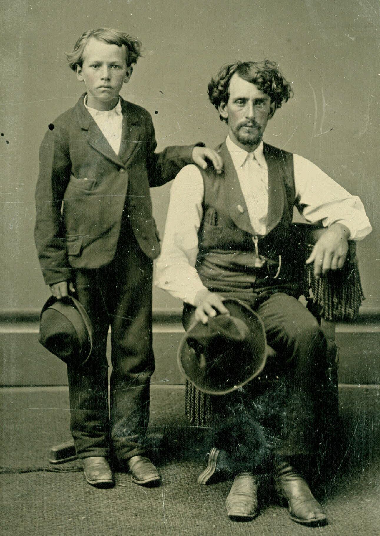 Source Citation: Staggers-Bowlby Album 01, Photo 19 - Jesse Enlow Patterson [standing] and Thomas J. Patterson [seated] - sons of Joseph Patterson and Elizabeth Mooney, item no. STAC_AN001_0019, Catherine Miranda (Staggers) Bowlby Collection, Greene Connections Archives Project (www.GreeneConnections.com).