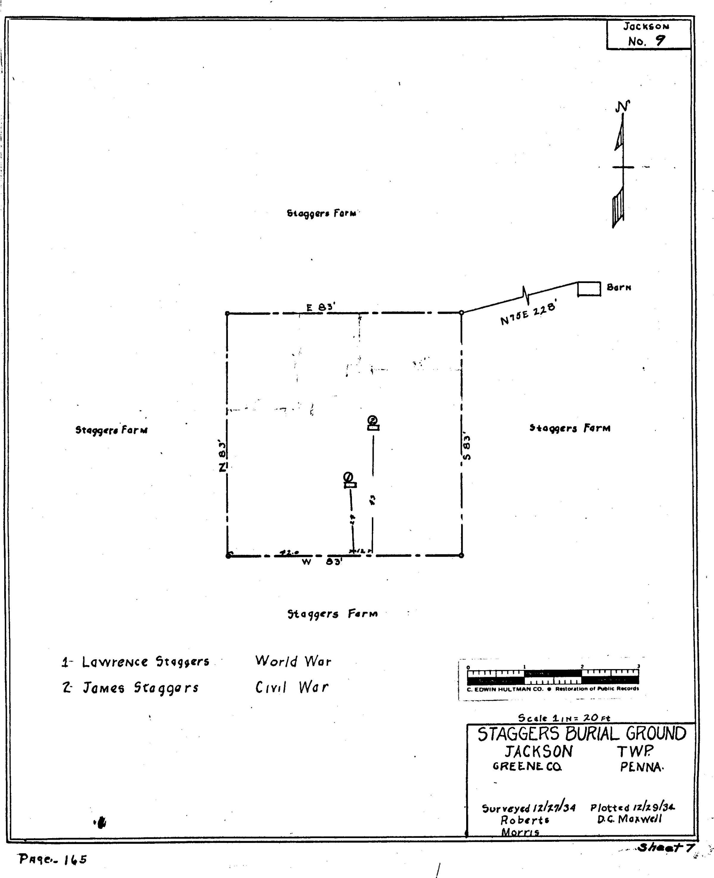 SOURCE CITATION: WPA Cemetery Plat - Pennsylvania - Greene County - Jackson Township - Staggers Cemetery (1934), item no. 2016.3.231, Cemetery Plat (WPA) Collection, surveyed by Works Projects Administration, copy on file at the Clerk of Courts Office, Greene County Courthouse, Greene Connections Archives Project (GreeneConnections.com).