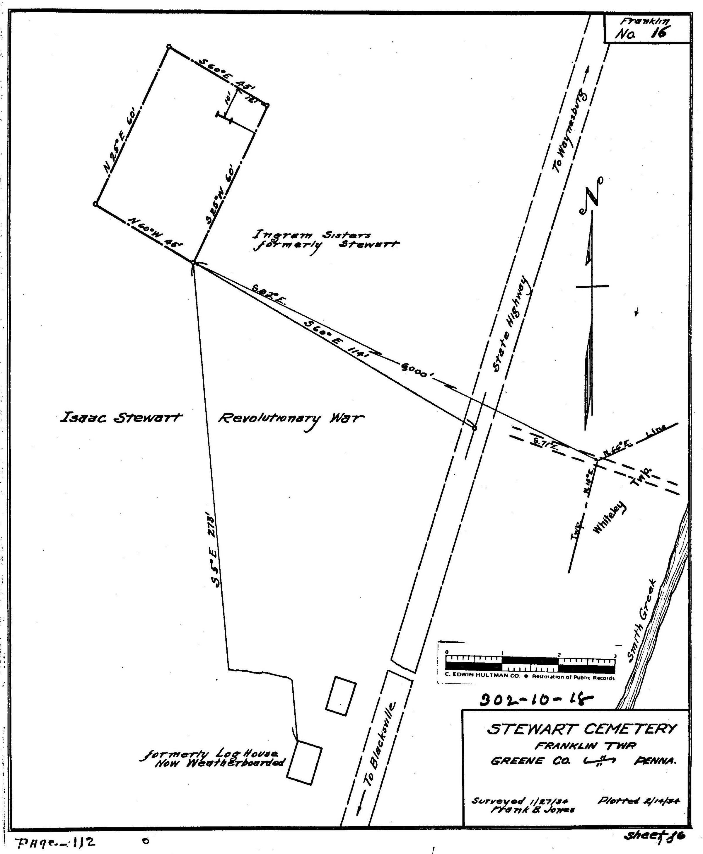 SOURCE CITATION: WPA Cemetery Plat - Pennsylvania - Greene County - Franklin Township - Stewart Cemetery (1934), item no. 2016.3.164, Cemetery Plat (WPA) Collection, surveyed by Works Projects Administration, copy on file at the Clerk of Courts Office, Greene County Courthouse, Greene Connections Archives Project (www.GreeneConnections.com).