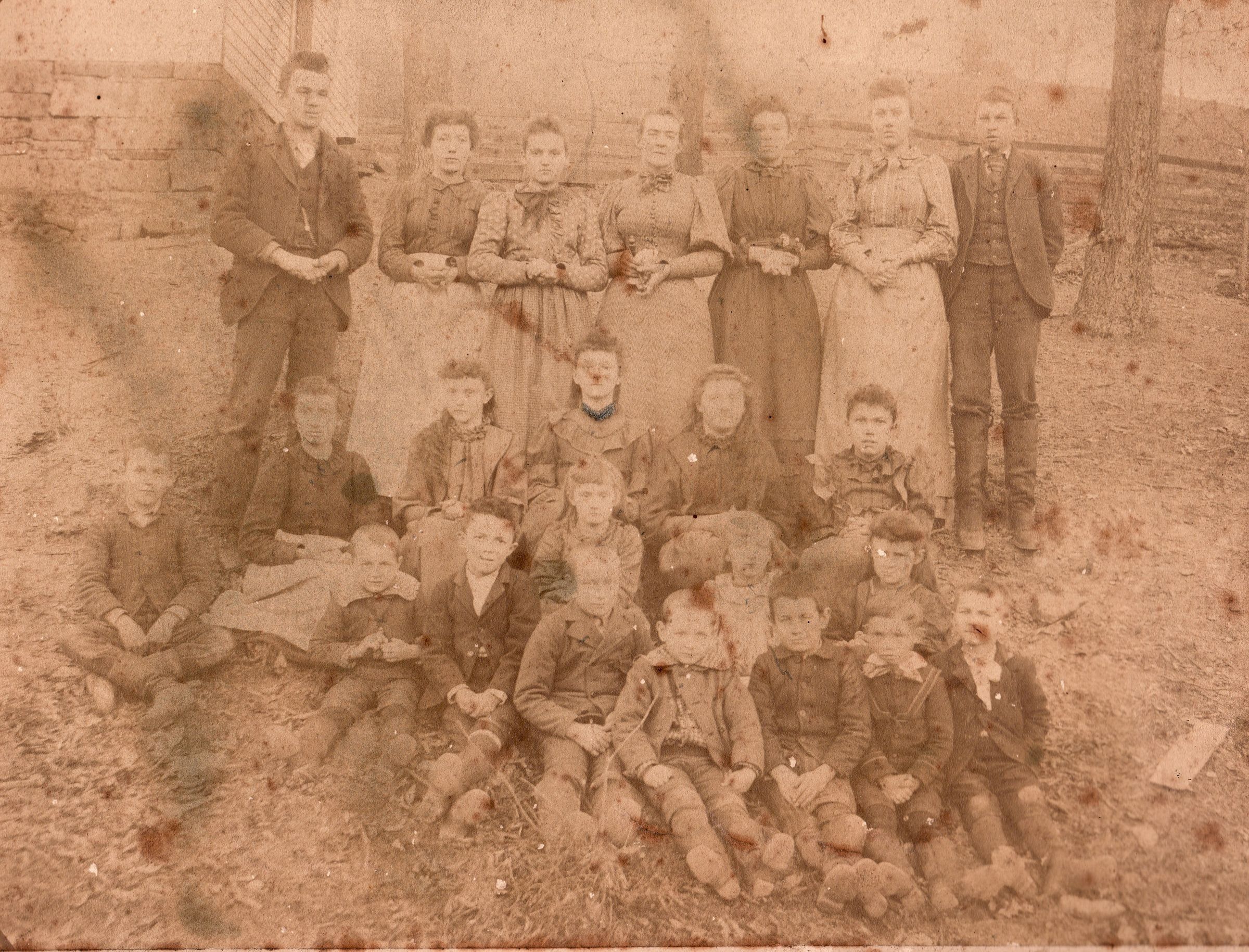 SOURCE CITATION: Teacher, John Leslie Carpenter [1877-1968], is standing back row, far left; circa 1895; item no. CARP-AN005-0020, Sellers Burdette and Bettie (Blake) Carpenter Collection, shared by their heirs; Greene Connections Archives Project (GreeneConnections.com).