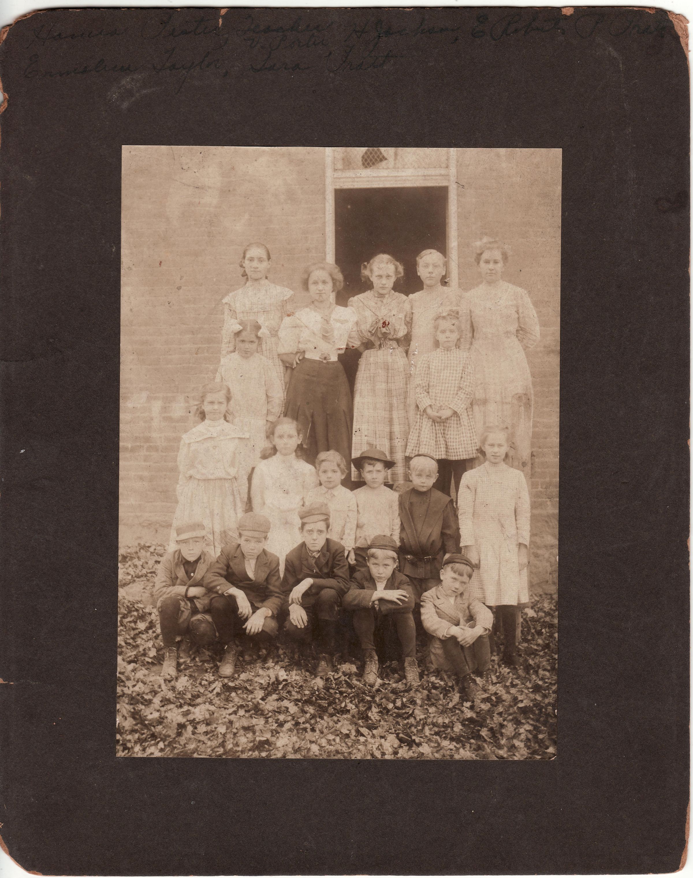 Handwritten inscription on back of photograph reads, "Pupils / Girls - Pearl Pratt, Helen Jackson, Hannah Pester, Ethel Roberts, Esther Worley, Belva Pratt, Elizabeth Pester, Sara Pratt, Ermaline Taylor / Boys - Earl Jackson, [Hard to read], Albert [Hard to read], Paul Morris, [Hard to read], Russell [Hard to read], Kenneth Jackson, [Hard to read] / Teacher - Viola Porter."