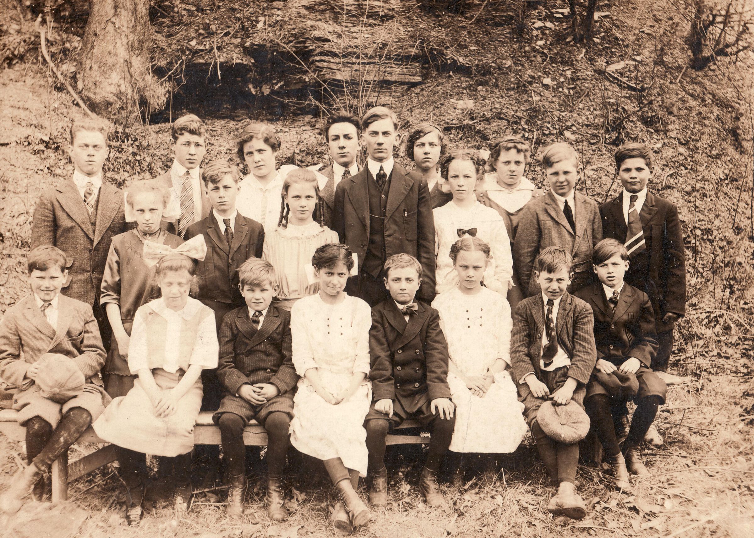 SOURCE CITATION: Cecil Harley Clutter [1896-1973] with his students in Greene County, Pennsylvania; circa 1915-1920; item no. SUPL-AN007-0010, School Series, Wayne Carl Swart Collection, Greene Connections Archives Project (www.GreeneConnections.com).