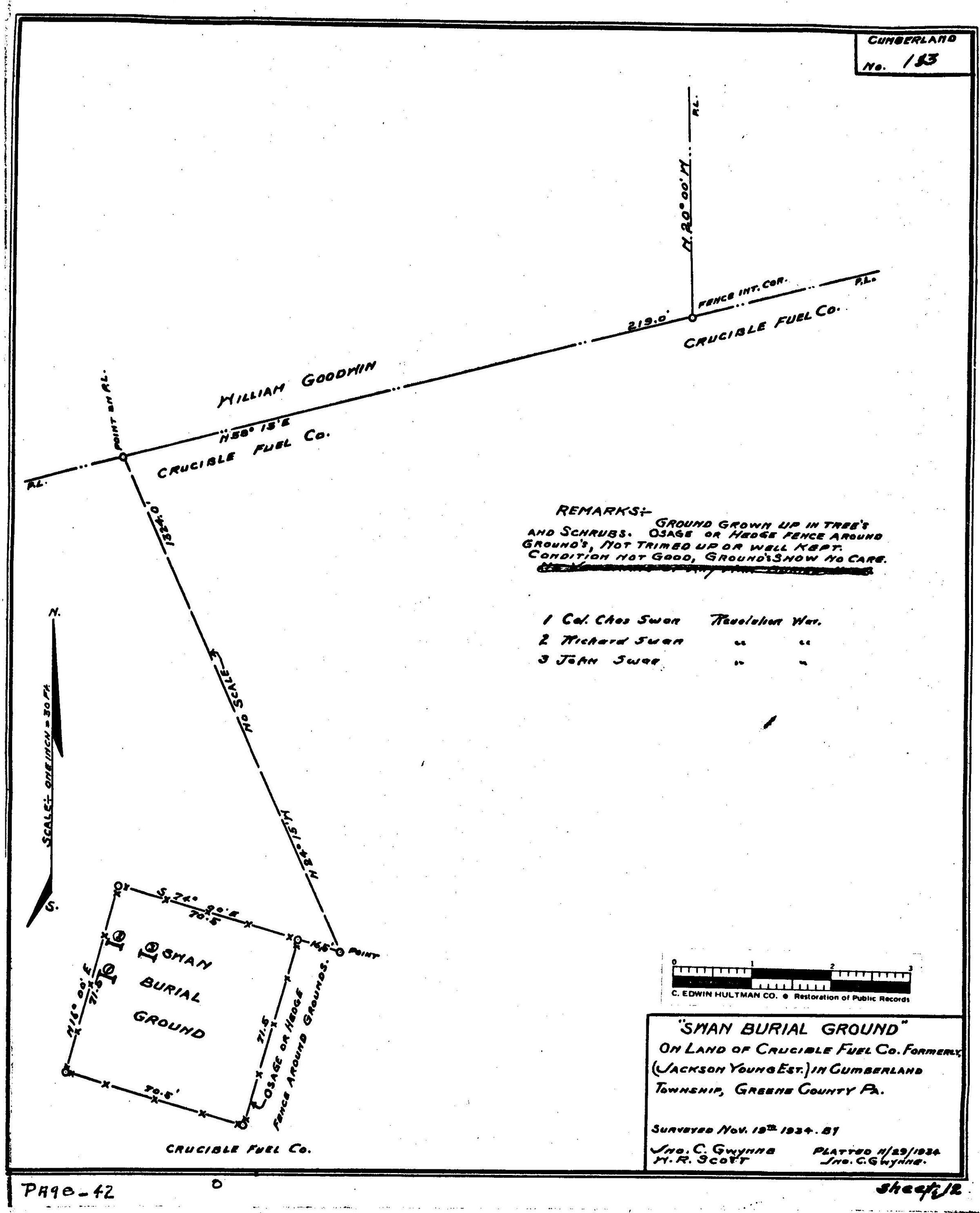 SOURCE CITATION: WPA Cemetery Plat - Pennsylvania - Greene County - Cumberland Township - Swan Cemetery (1934), item no. 2016.3.185, Cemetery Plat (WPA) Collection, surveyed by Works Projects Administration, copy on file at the Clerk of Courts Office, Greene County Courthouse, Greene Connections Archives Project (www.GreeneConnections.com).