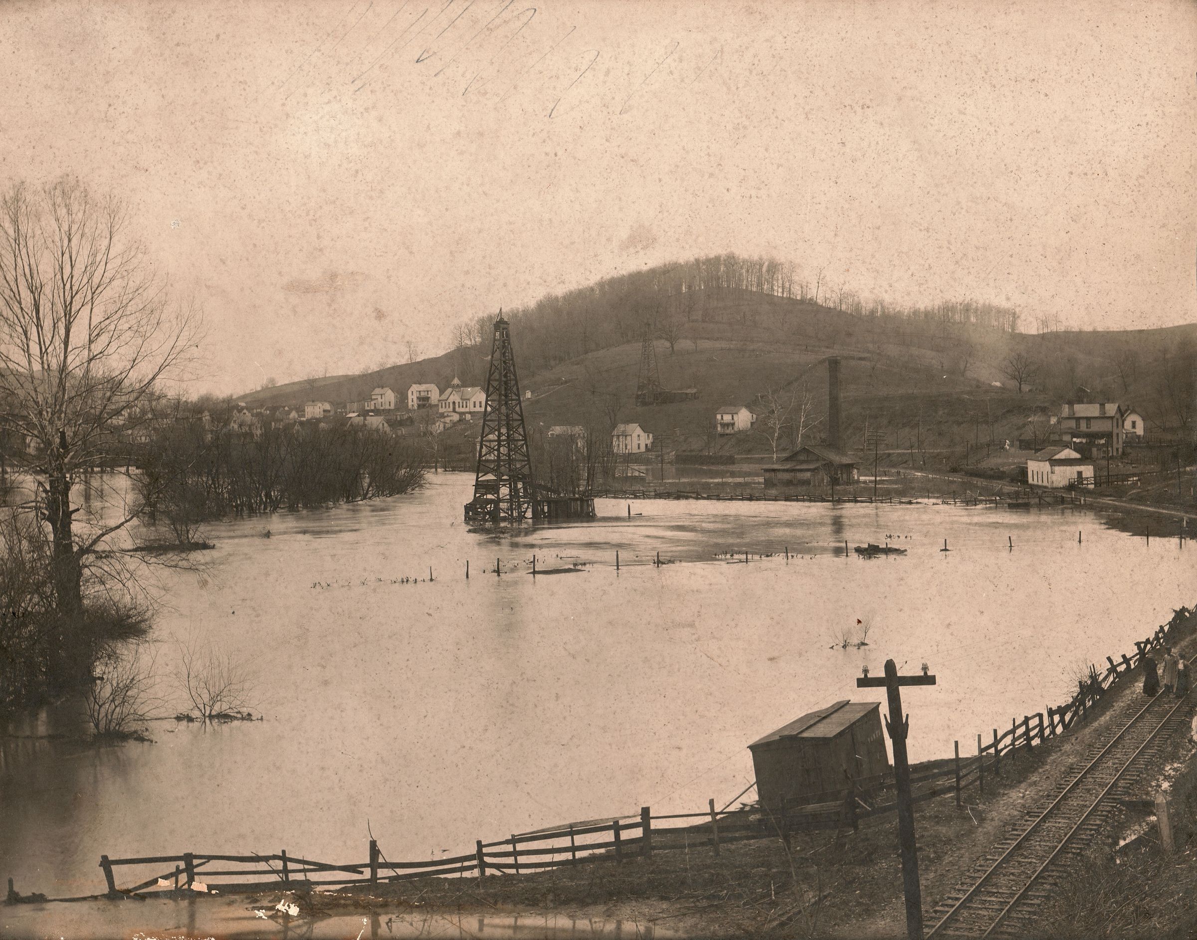 Source Citation: Ten Mile Creek flooding, near the Waynesburg & Washington railroad tracks, in West Waynesburg, Greene County, Pennsylvania; item no. WAYN_AN004_0008, donated by Walter Bruce, Waynesburg University Paul R. Stewart Museum Collection, Greene Connections Archives Project (www.GreeneConnections.com).