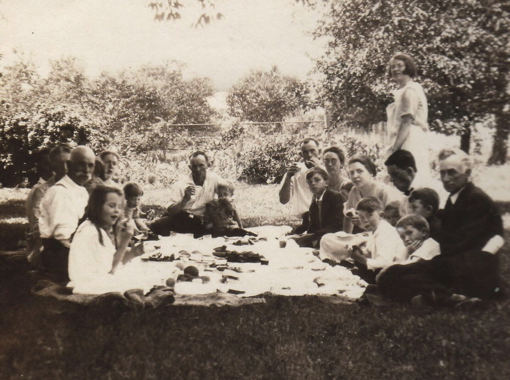 SOURCE CITATION: Thomas Harvey Cook [1859-1938] and his wife, Sarah Matilda "Sadie" (Grandon) Cook [1862-1942], picnicking with their family; circa 1925; item no. CAND_AN001_0016, Cook Series, Candice Lynn Buchanan Collection; Greene Connections Archives Project (GreeneConnections.com).