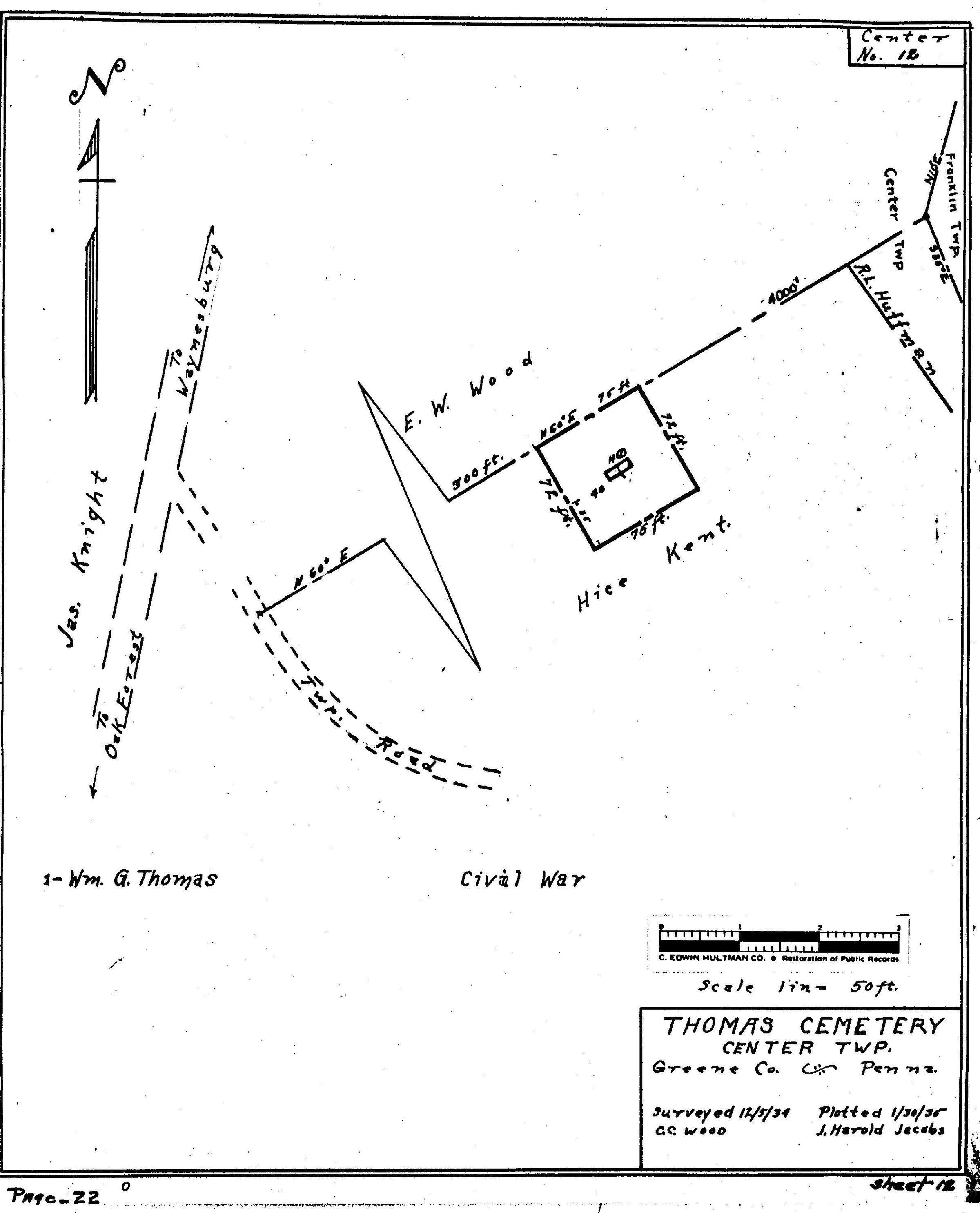 Source Citation: WPA Cemetery Plat - Pennsylvania - Greene County - Center Township - Thomas Cemetery (1934), item no. 2016.3.44, Cemetery Plat (WPA) Collection, surveyed by Works Projects Administration, copy on file at the Clerk of Courts Office, Greene County Courthouse, Greene Connections Archives Project (www.GreeneConnections.com).