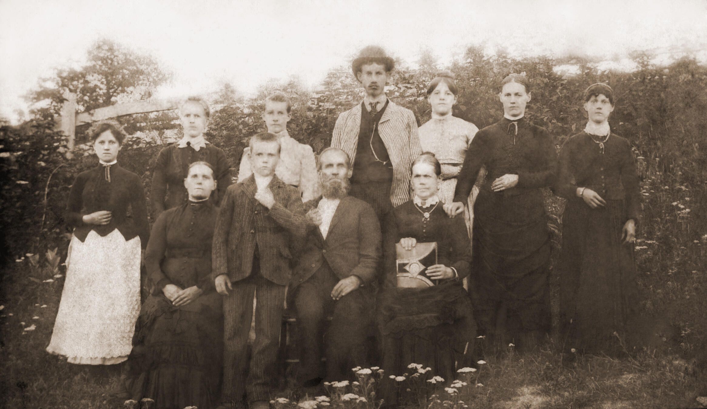 BACK ROW - believed to be Cora A. Fry, believed to be Mary M. Fry, believed to be Louisa Fry, believed to be Charles W. Fry, believed to be Susannah A. Fry;