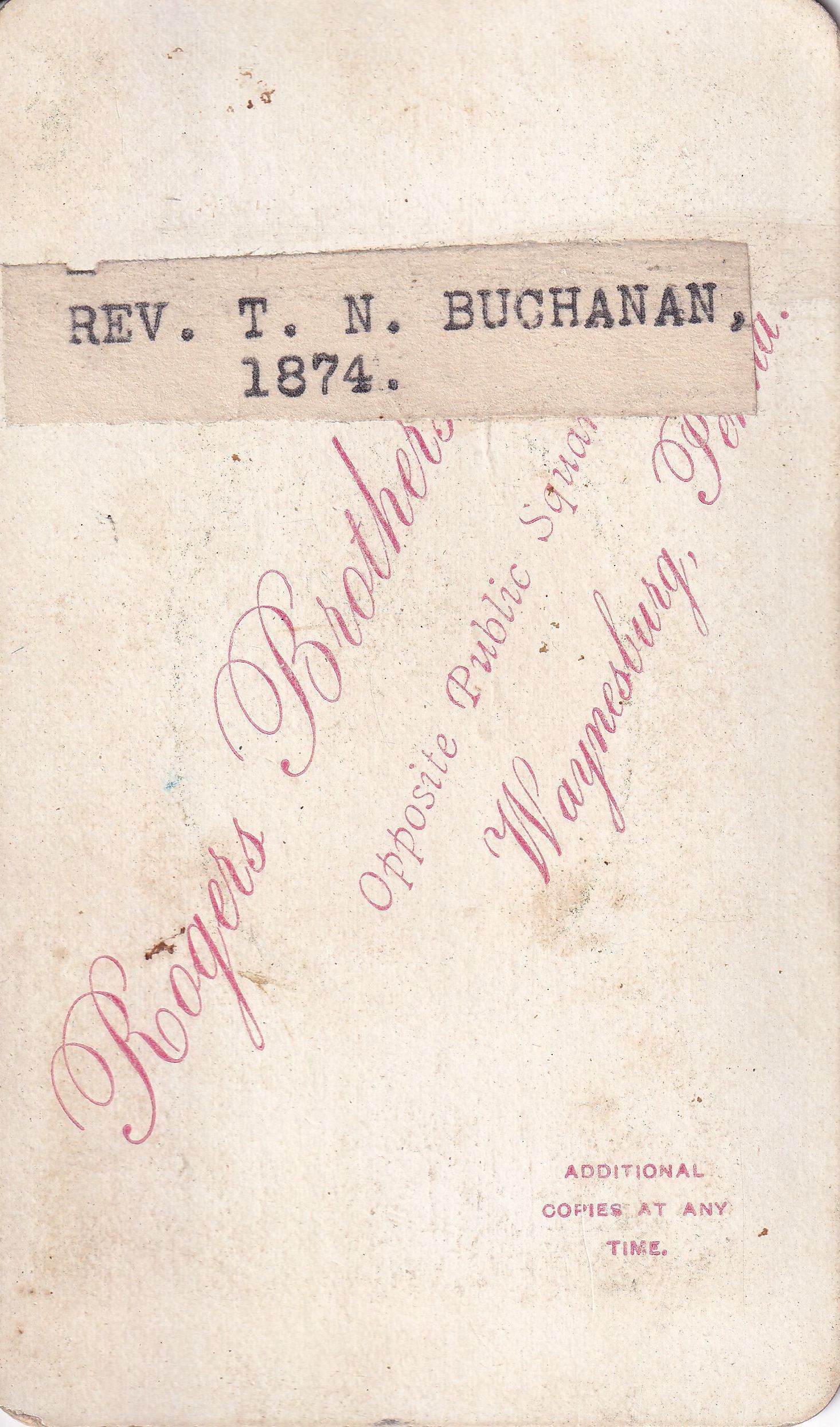 SOURCE CITATION: Thomas N. Buchanan [1850-1915], Waynesburg College, Class of 1874; circa 1870-1875, image by Rogers Brothers, Opposite Public Square, Waynesburg, Penna.; item no. WAYN_AN001_1874_0015, Waynesburg University Paul R. Stewart Museum Collection; Greene Connections Archives Project (GreeneConnections.com).