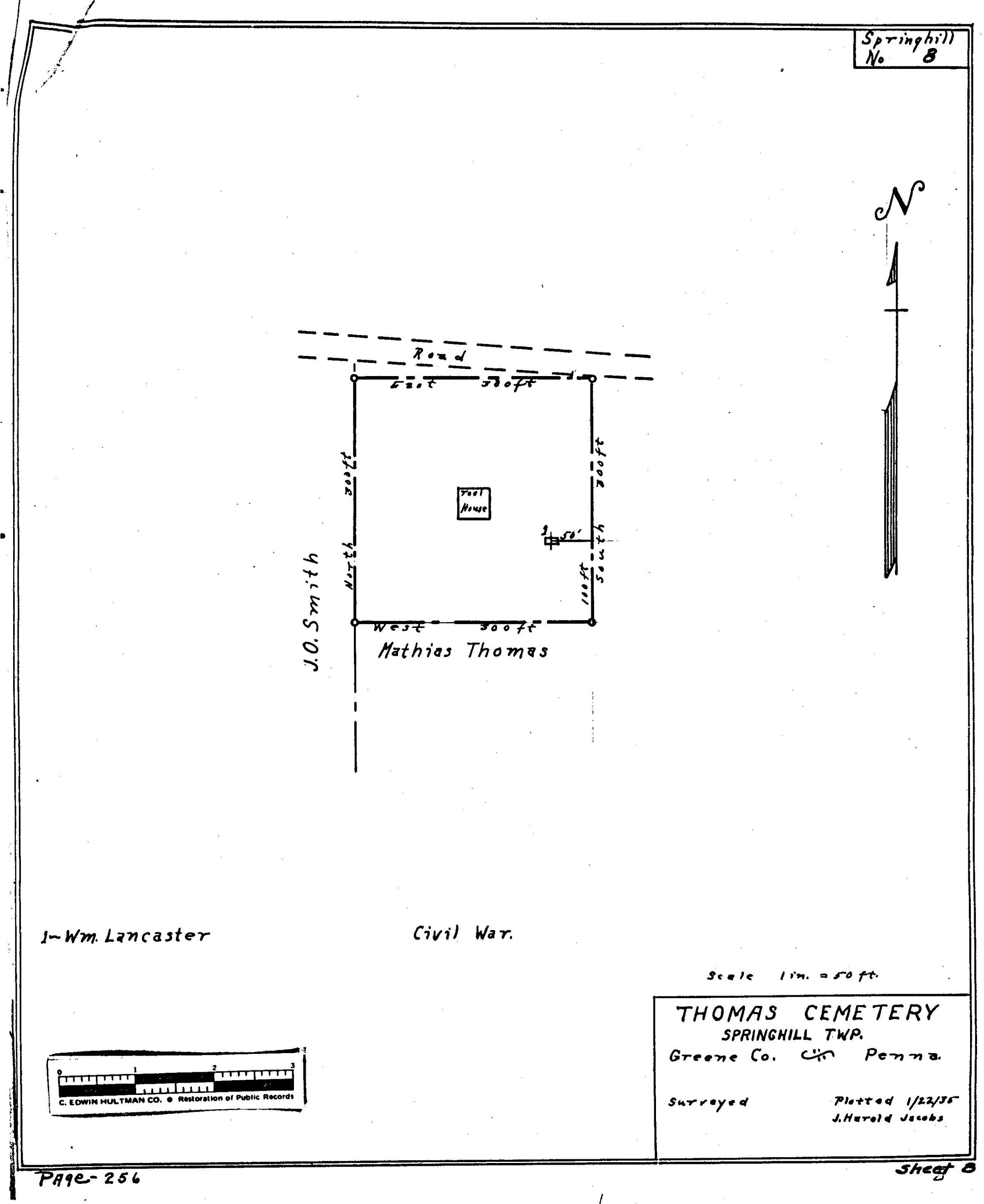 SOURCE CITATION: WPA Cemetery Plat - Pennsylvania - Greene County - Springhill Township - Thomas Cemetery (1935), item no. 2016.3.243, Cemetery Plat (WPA) Collection, surveyed by Works Projects Administration, copy on file at the Clerk of Courts Office, Greene County Courthouse, Greene Connections Archives Project (GreeneConnections.com).