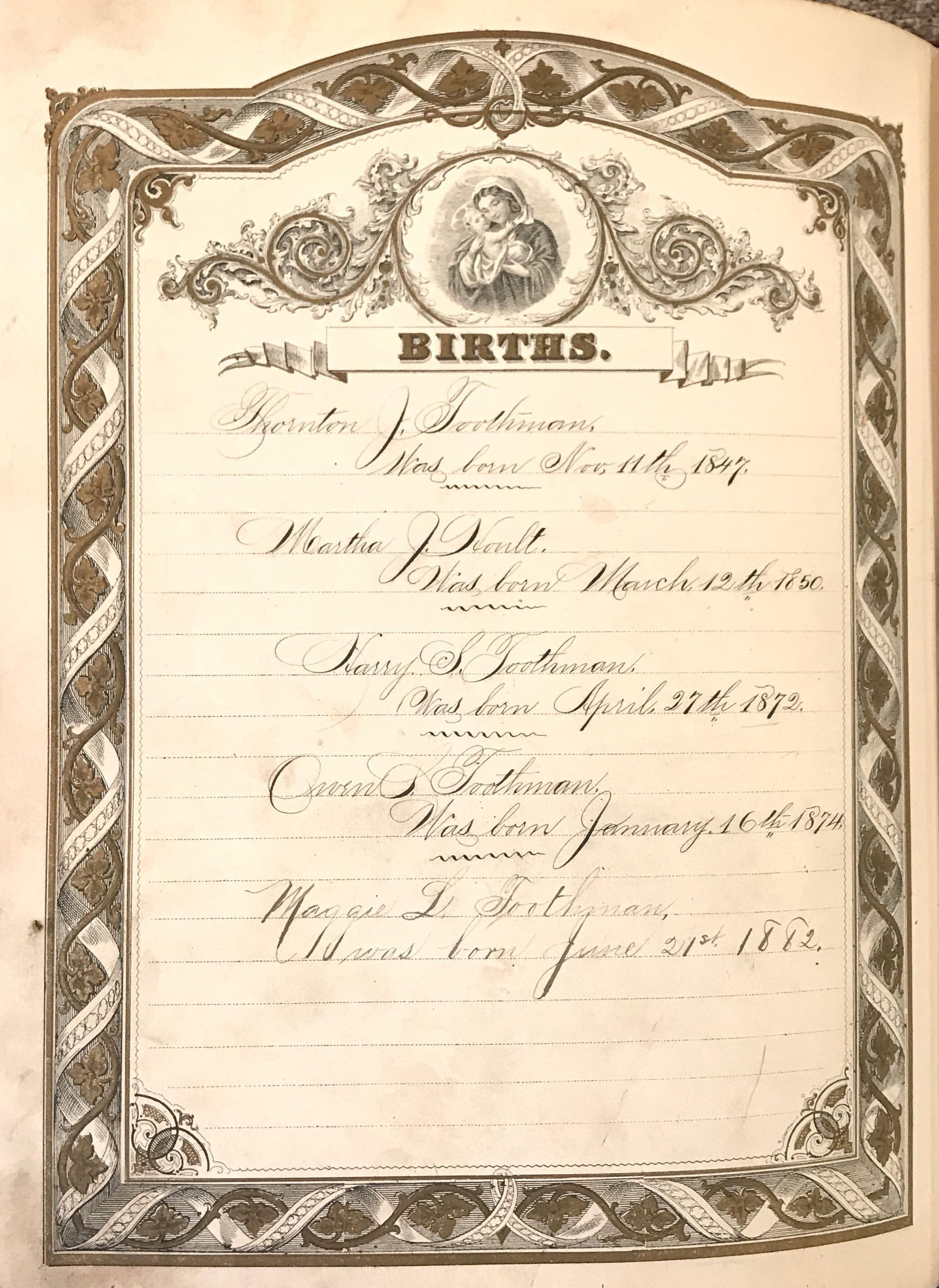 Thornton Jacob Toothman and Martha Jane (Hoult) Toothman Family Bible Records, 1847-1896, Holy Bible (Philadelphia, Pennsylvania: A. J. Holman & Co., 1874); privately held by Glenn Jacob Roy Thornton Toothman III, Waynesburg, Pennsylvania, 2022.