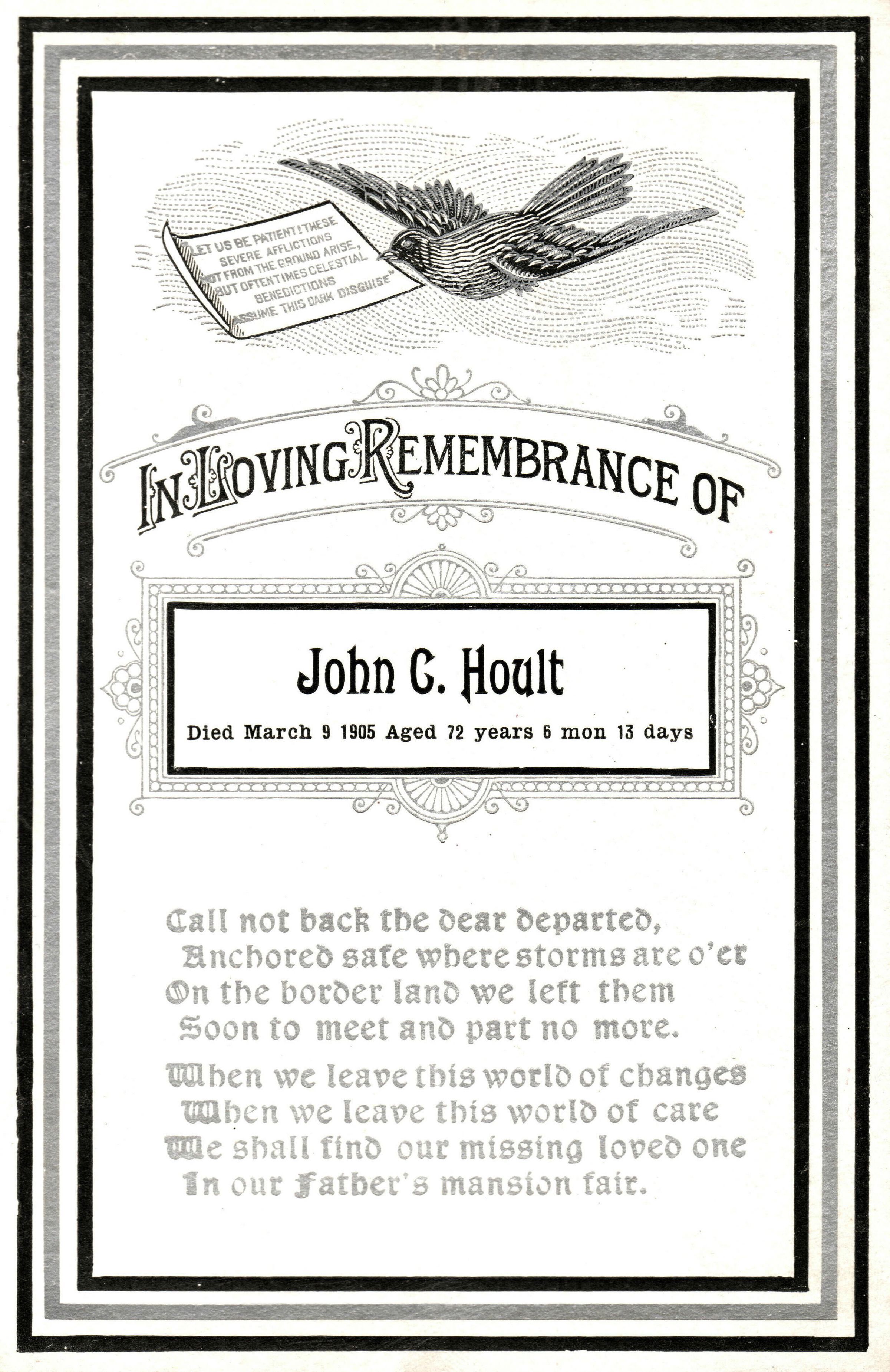 SOURCE CITATION: Toothman-Hoult Album, Photo 02 - Funeral card of John Cunningham Hoult [1832-1905]; item no. TOOK_AN003_0002_0002, Katherine Jane (Throckmorton) Toothman Collection, Greene Connections: Greene County, Pennsylvania Archives Project (www.GreeneConnections.com).