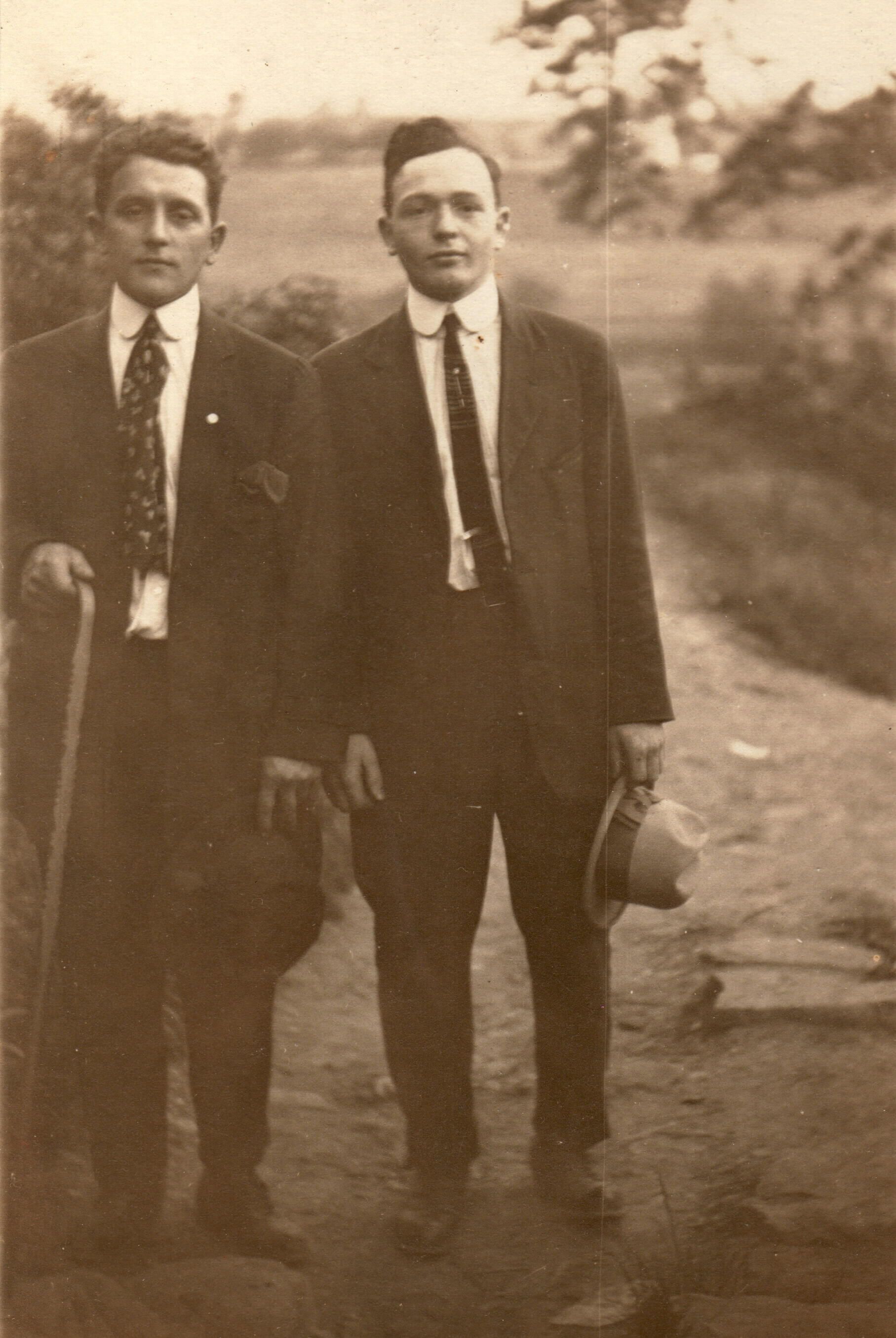 SOURCE CITATION: Toothman-Hoult Album, Photo 04 - [Left-Right]: Omer Scott Toothman [1874-1964] and his son, Kenneth R. Toothman [1898-1918]; circa 1915-1917; item no. TOOK_AN003_0002_0004, Katherine Jane (Throckmorton) Toothman Collection, Greene Connections: Greene County, Pennsylvania Archives Project (www.GreeneConnections.com).