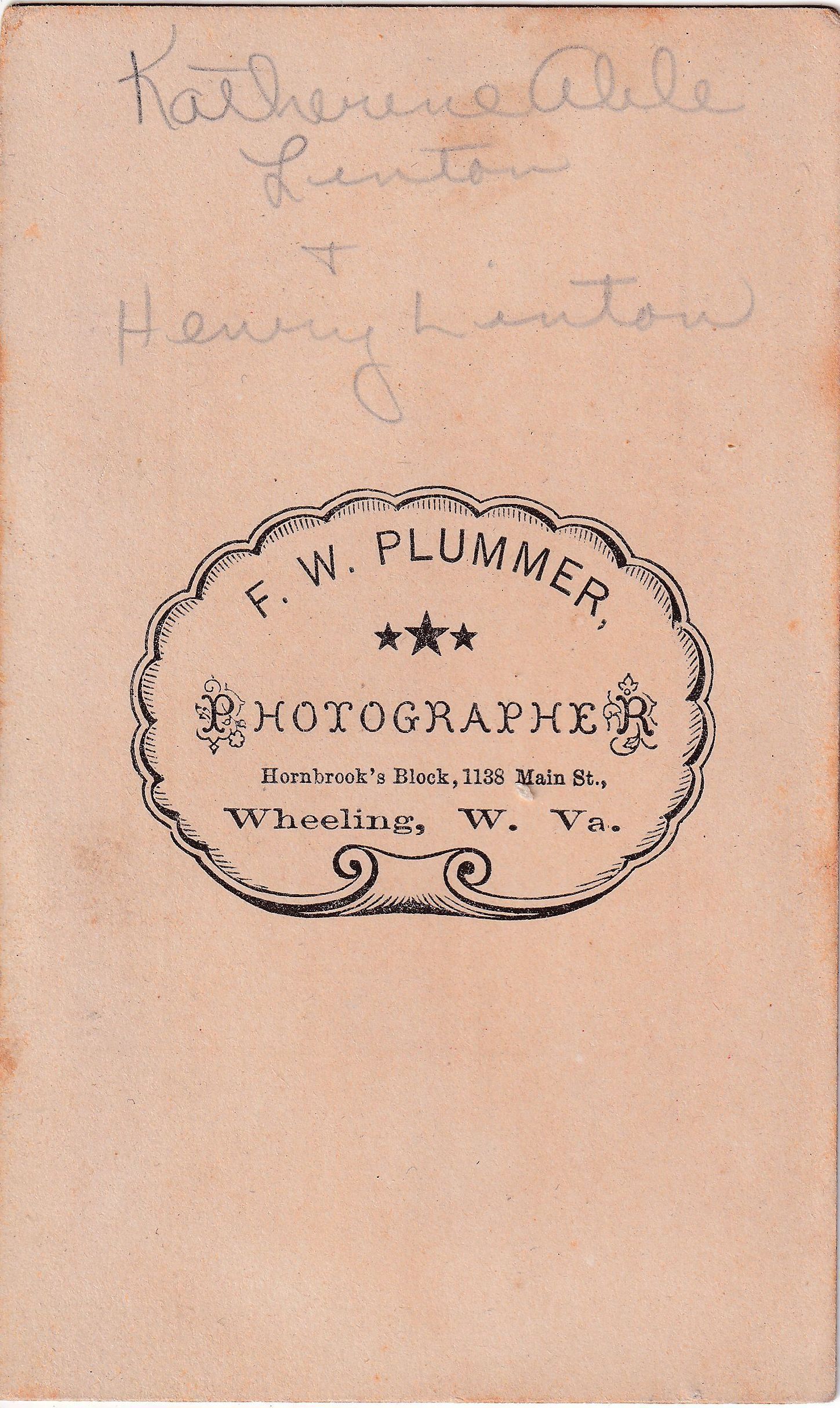 SOURCE CITATION: Carte-de-visite; circa 1860-1890, image by F. W. Plummer, Photographer, Hornbrook's Block, 1138 Main Street, Wheeling, W. Va.; item no. MILB-AN001-0006-0037, Vance Series, Mary (Vance) McCann Collection, shared by her grandson, William Marshall Miller; Greene Connections Archives Project (www.GreeneConnections.com).