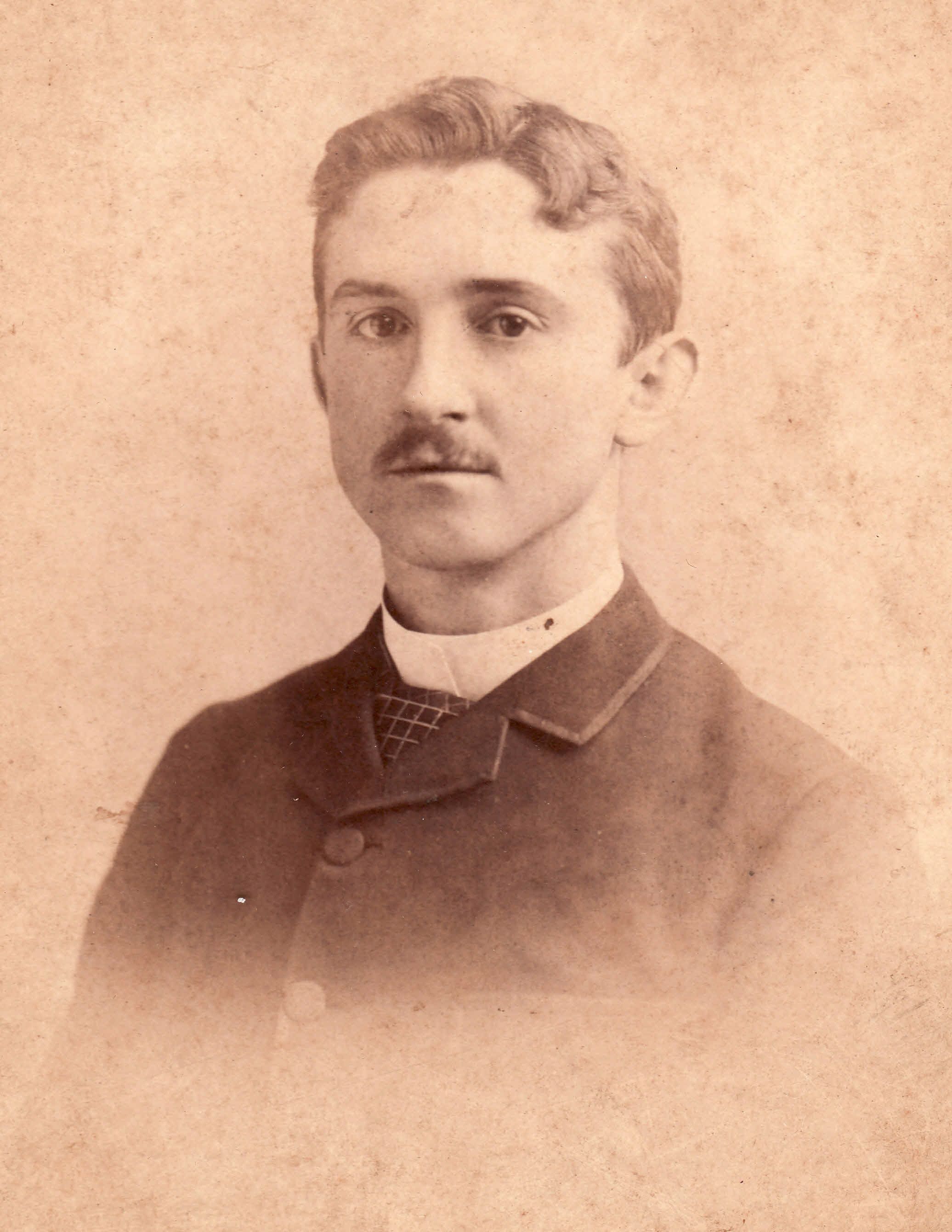NOTES ON CAPTION: Handwritten inscription on photo indicates he may be Clarence Tracy Mooney [1890-1926], but as the photo appears to be a young man posing in circa 1885-1890, this identity cannot be correct. This subject was probably born in 1860s.