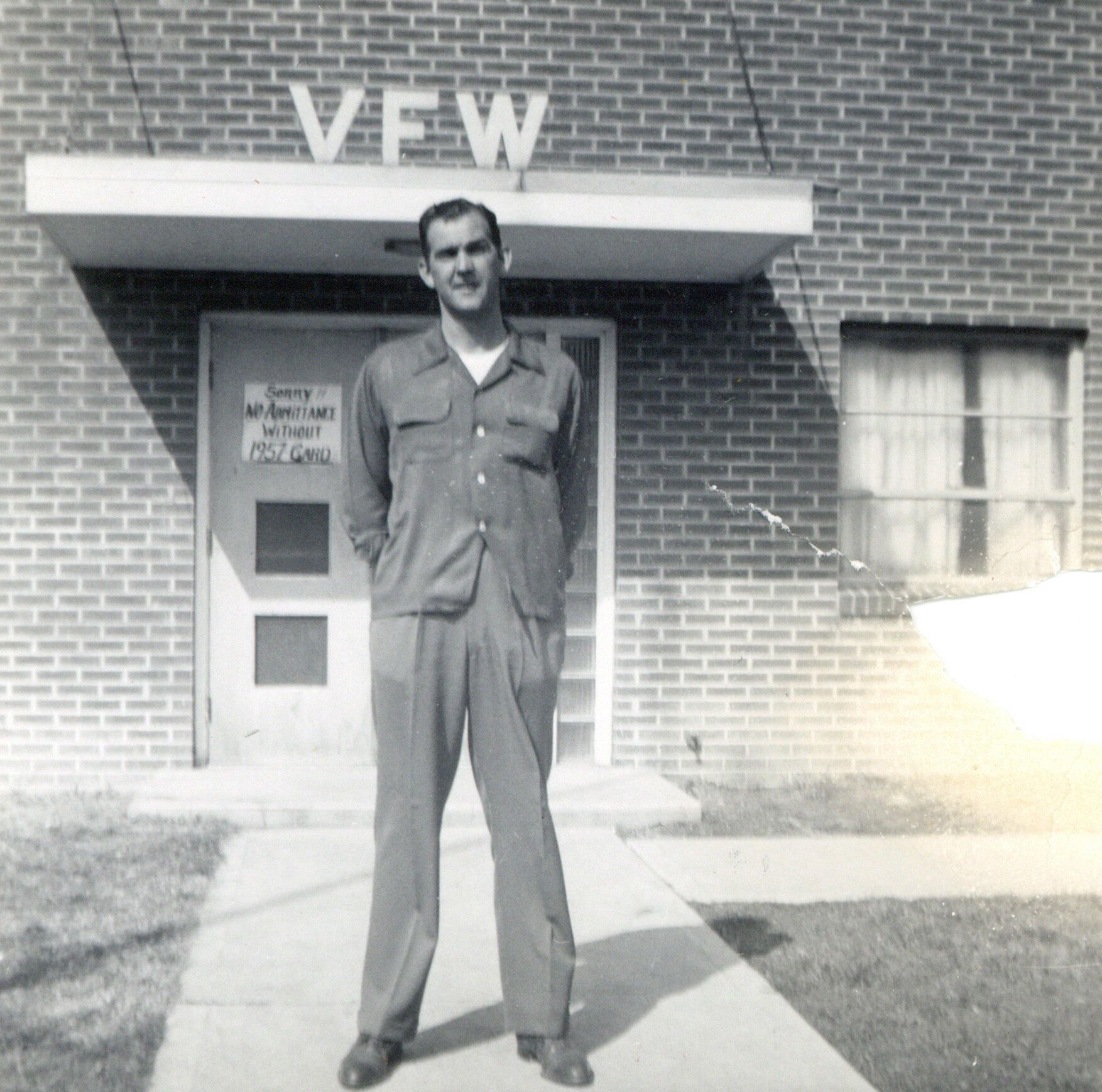 Source Citation: Unidentified man in front of Veterans of Foreign Wars (VFW) building on Lincoln Street in Waynesburg, Greene County, Pennsylvania, item no. KIND0028, Donna Louise (Finch) Evans Collection, Greene Connections Archives Project (www.GreeneConnections.com).