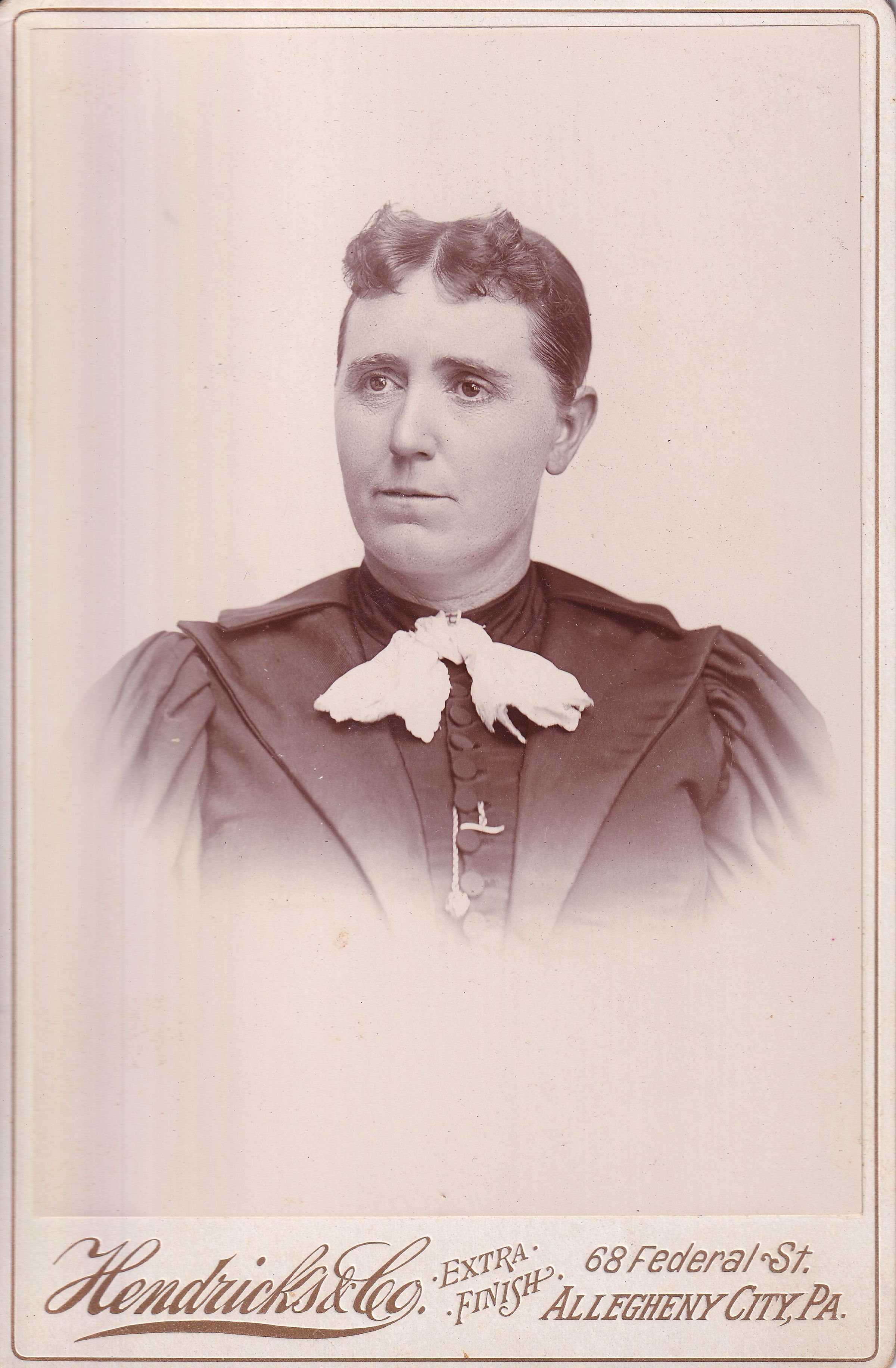 SOURCE CITATION: Vance-McFarland Album 03, Photo 03 - Minnie (King) Vance [1873-1956]; circa 1895-1900, image by Hendricks & Co., 68 Federal Street, Allegheny City, Pa.; item no. MILB-AN001-0003-0003, Mary (Vance) McCann Collection, shared by her grandson, William Marshall Miller; Greene Connections Archives Project (www.GreeneConnections.com).