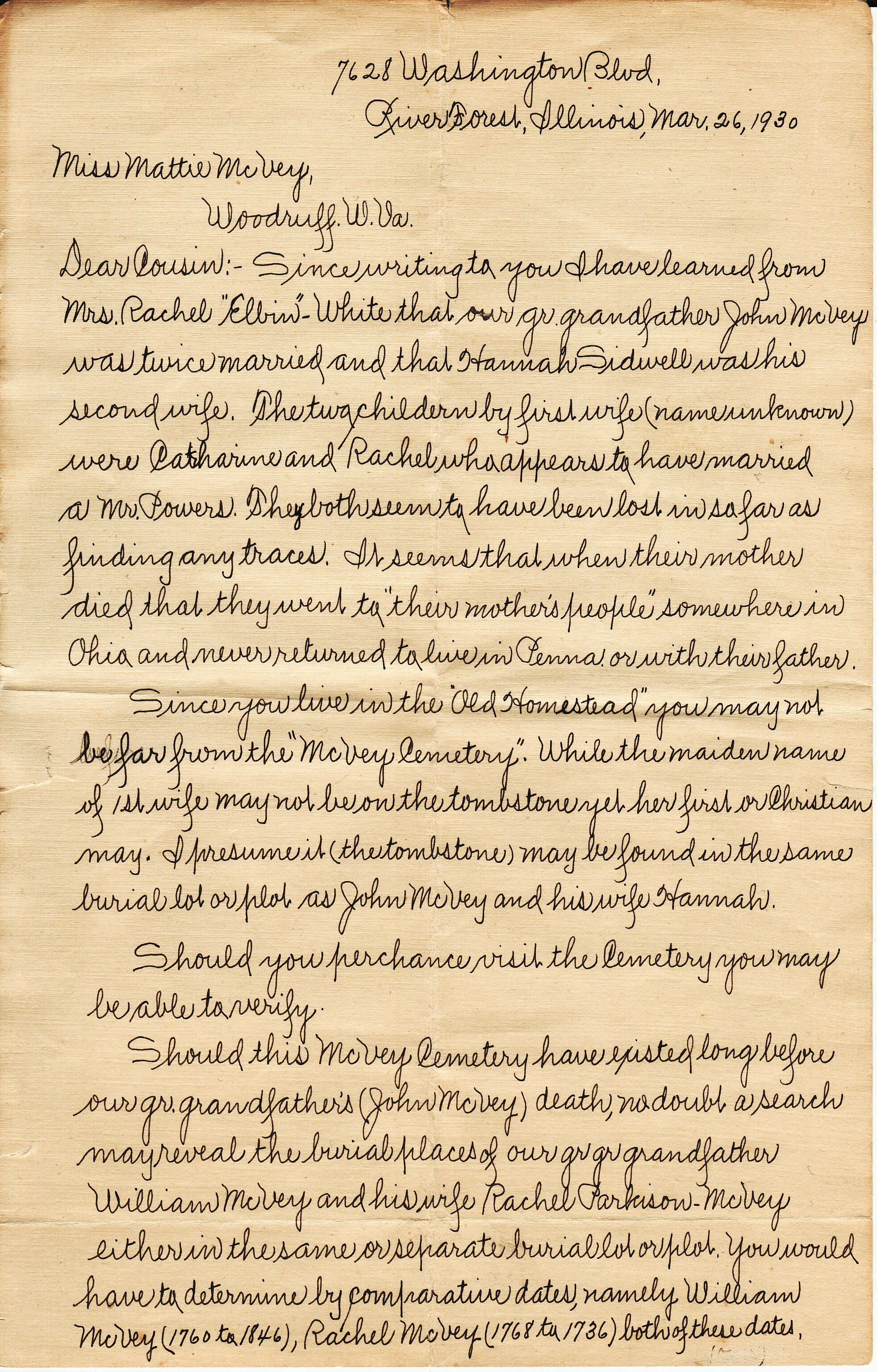 SOURCE CITATION: W. S. Perry (son of Ebenezer Perry & Almina McVay) of River Forest, Illinois, to Mattie McVay (daughter of William Irwin McVay & Elizabeth D. Woodruff) of Woodruff, West Virginia, letter, 26 March 1930, item no. MCVA-AN001-DOCU-0001, Rex and Irene Marie (Morgan) McVay Collection, shared by Lisa (McVay) Hook, Greene Connections Archives Project (www.GreeneConnections.com).