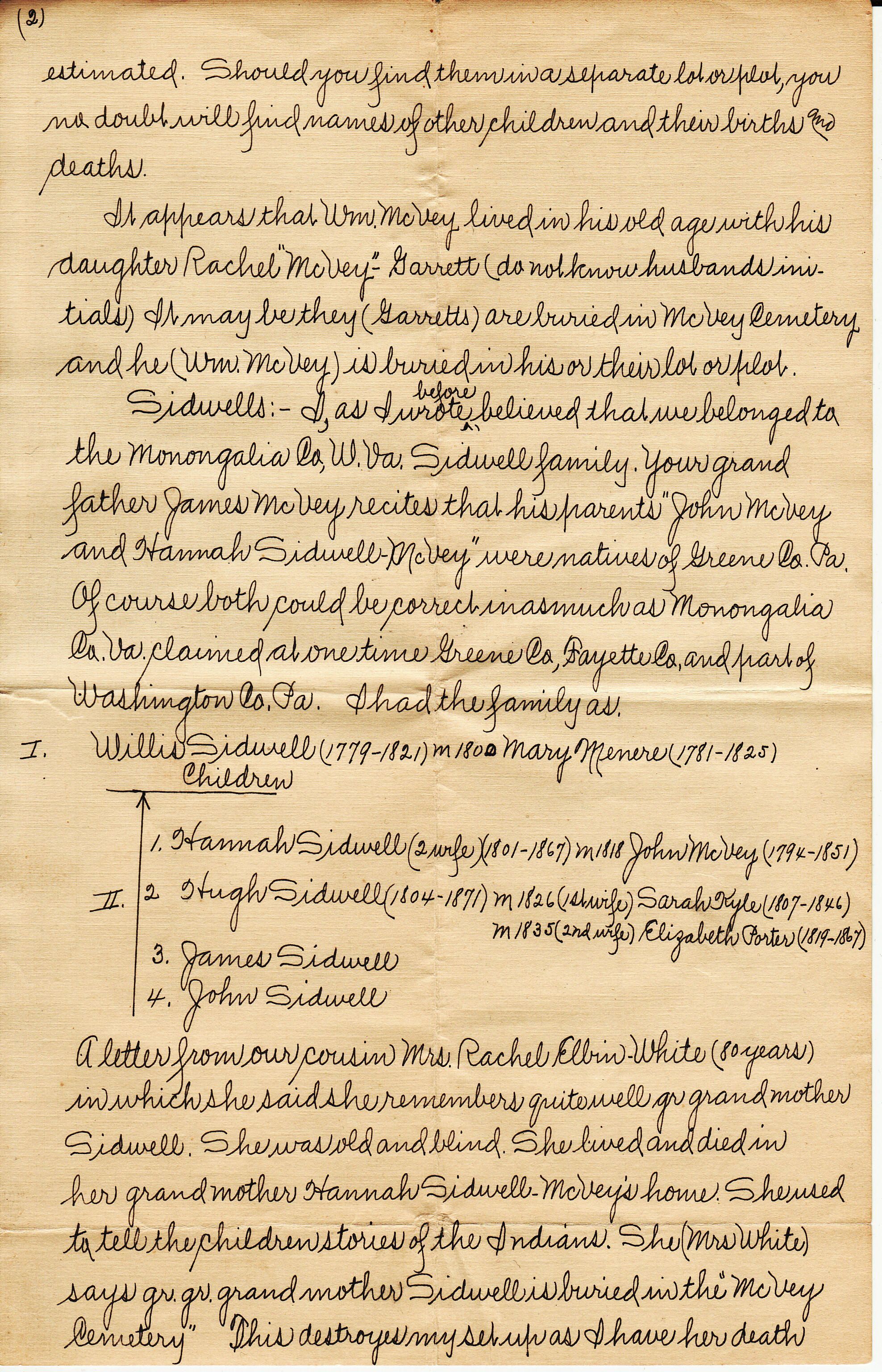 Sidwells: I, as I wrote before believed that we belonged to the Monongalia Co., W. Va. Sidwell family. Your grand father James McVey recites that his parents 'John McVey and Hannah Sidwell McVey' were natives of Greene Co. Pa. Of course both could be correct in as much as Monongalia Co. Va. claimed at one time Greene Co., Fayette Co., and part of Washington Co. Pa. I had the family as