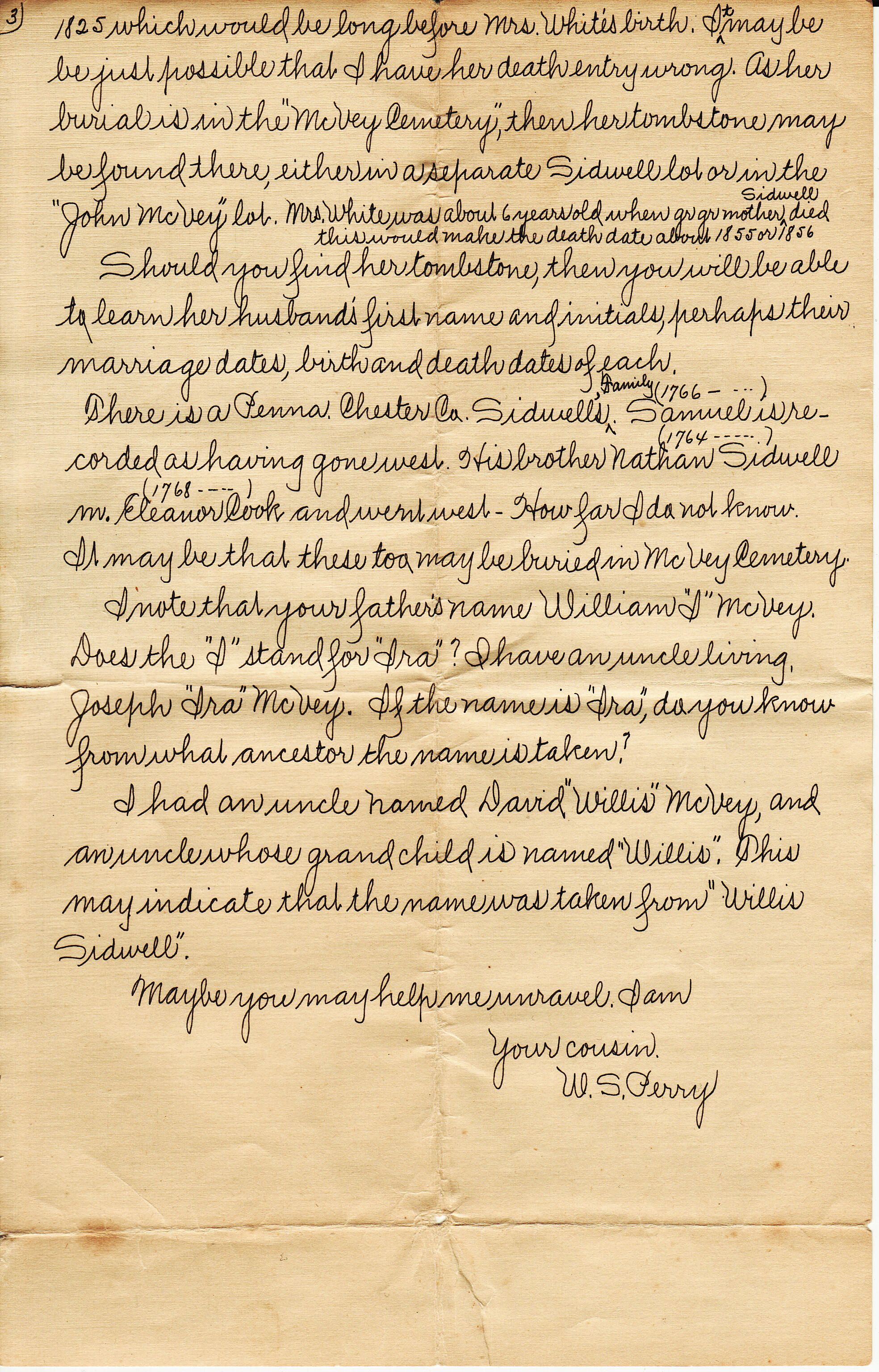 A letter from our cousin Mrs. Rachel Elbin White (80 years) in which she said she remembers quite well gr grand mother Sidwell. She was old and blind. She lived and died in her grand mother Hannah Sidwell-McVey's home. She used to tell the children stories of the Indians. She (Mrs. White) says gr. gr. grandmother Sidwell is buried in the 'McVey Cemetery.' This destroys my set up as I have her death 1825 which would be long before Mrs. White's birth. It may be just possible that I have her death entry wrong. As her burial is in the 'McVey Cemetery,' then her tombstone may be found there, either in a separate Sidwell lot or in the 'John McVey' lot. Mrs. White was about 6 years old when gr gr grandmother Sidwell died this would make the death date around 1855 or 1856.