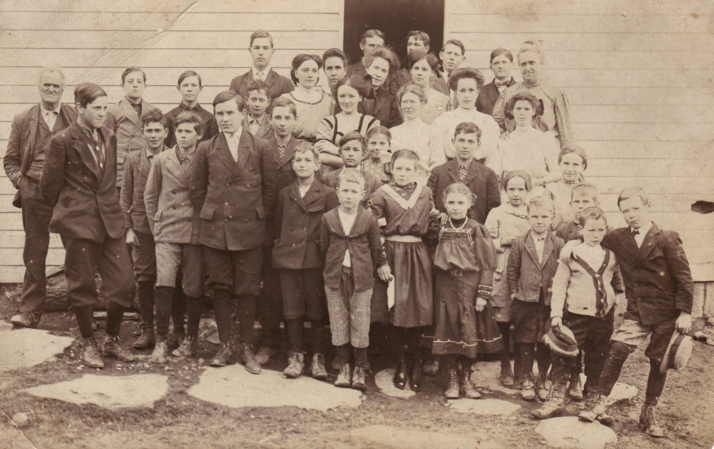 Real-photo postcard of teachers and students at the Wagon Run Road Schoolhouse in Springhill Township, Greene County, Pennsylvania.