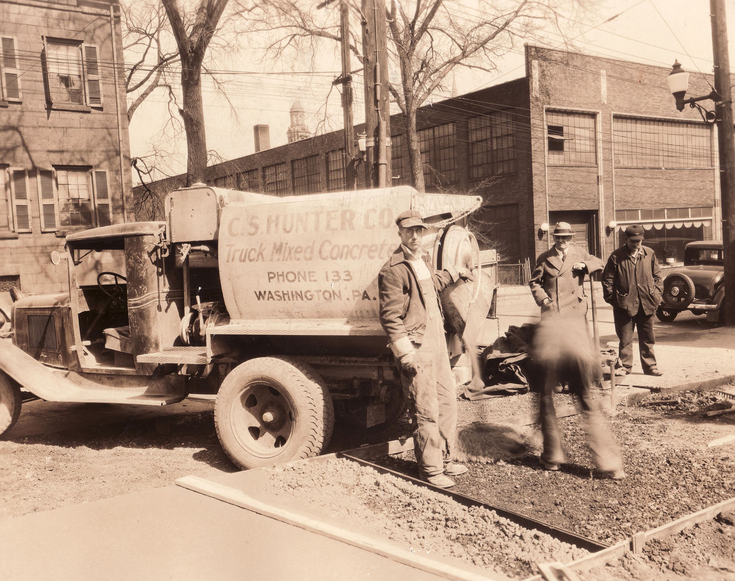 Truck says, "C. S. Hunter Co. / Truck Mixed Concrete / Phone 133 / Washington, Pa."