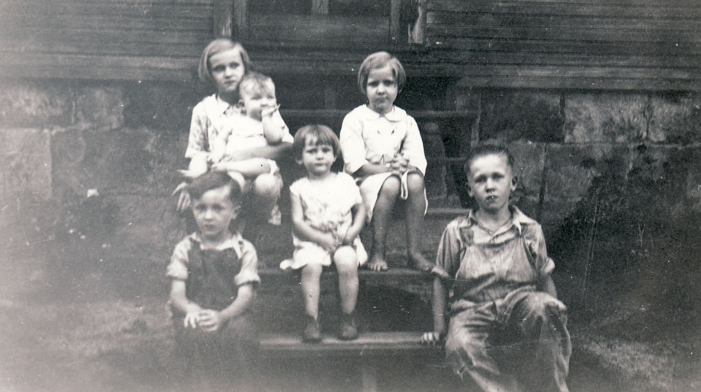 SOURCE CITATION: Walter Irvin Moore Sr. [1900-1987] and Lillian Irene (Cooley) Moore [1899-1976] family, pictured [Left-Right]: BACK - Thelma Irene (Moore) Deal [1923-2002] holding Edna Maude (Moore) Randolph [1931-], Mildred Leona (Moore) Whitlock [1925-2009], MIDDLE - Margery Ellen (Moore) Whetzel [1930-2025], FRONT - Walter Irvin Moore Jr. [1927-2005], Frank Oliver Moore [1924-2018]; circa 1931-1932; item no. WHET_AN002_0001_0018, Robert Dewayne and Margery Ellen (Moore) Whetzel Collection, Greene Connections Archives Project (GreeneConnections.com).