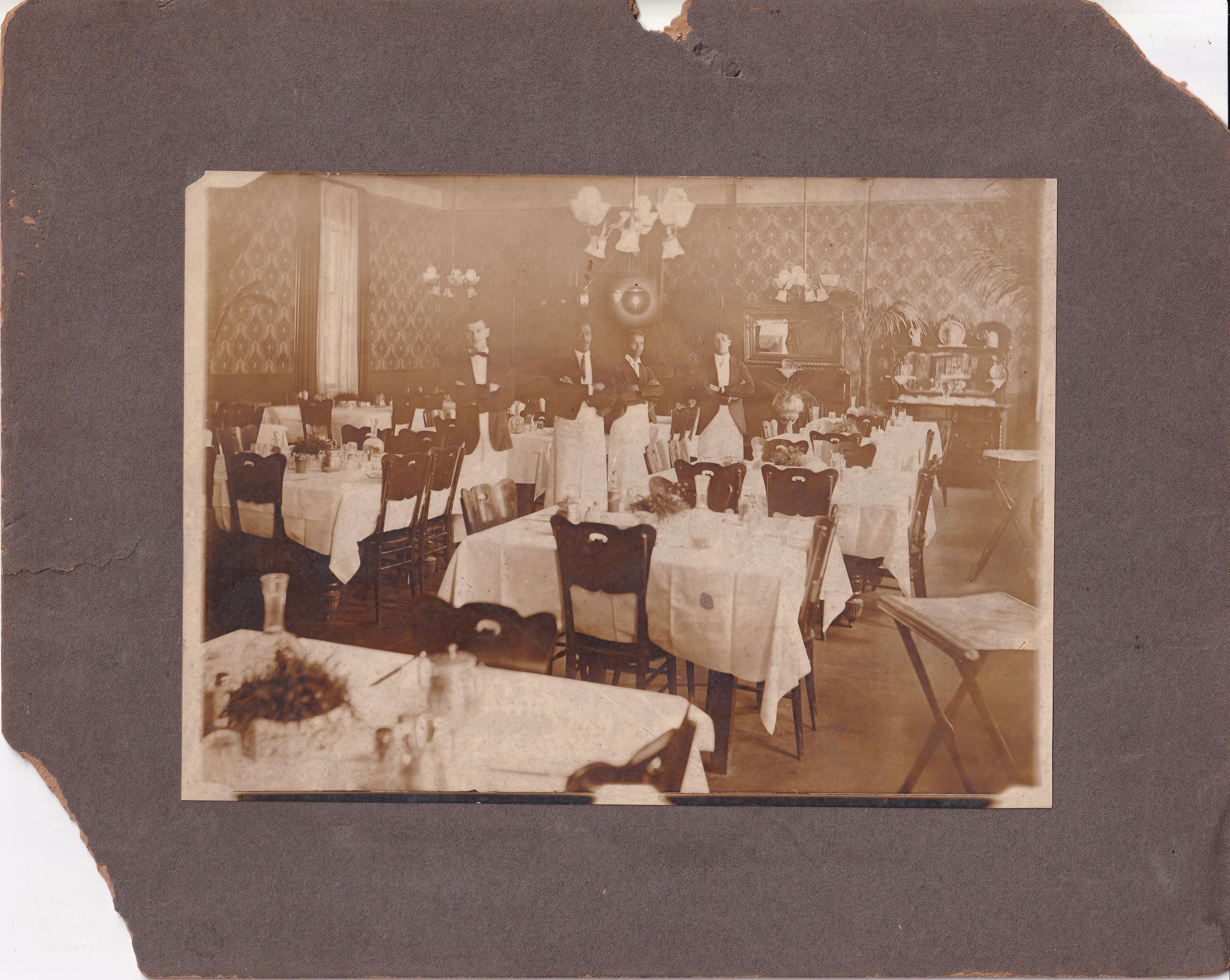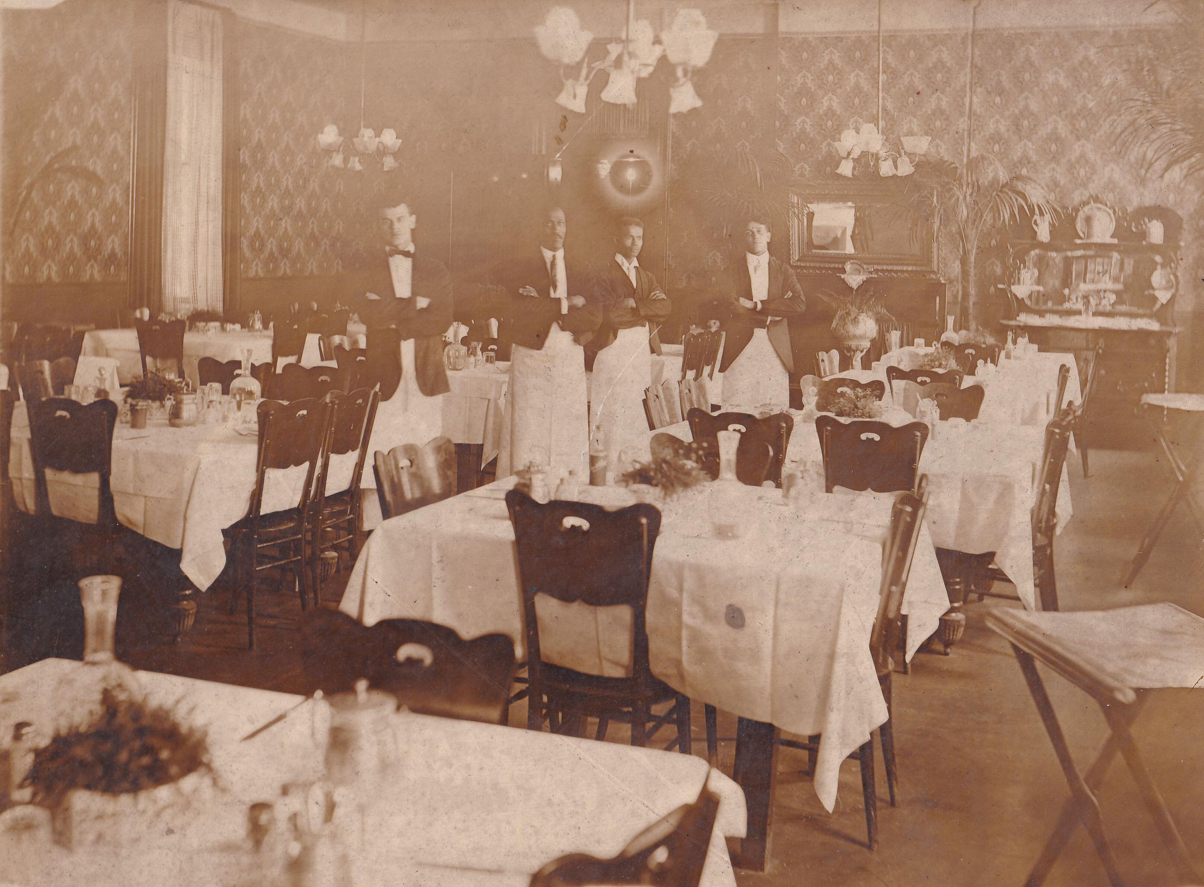 Research submitted by Carole Clarke and Candice Buchanan has contributed to the potential identifications noted here. Census records for 1900, 1910, and/or 1920, as well as World War I draft cards, indicate the Burgess, Hall, and Hickey men worked as waiters, or more specifically as waiters at a hotel. Harry Hickey’s WWI draft card lists him as a hotel waiter employed by the Walton family.