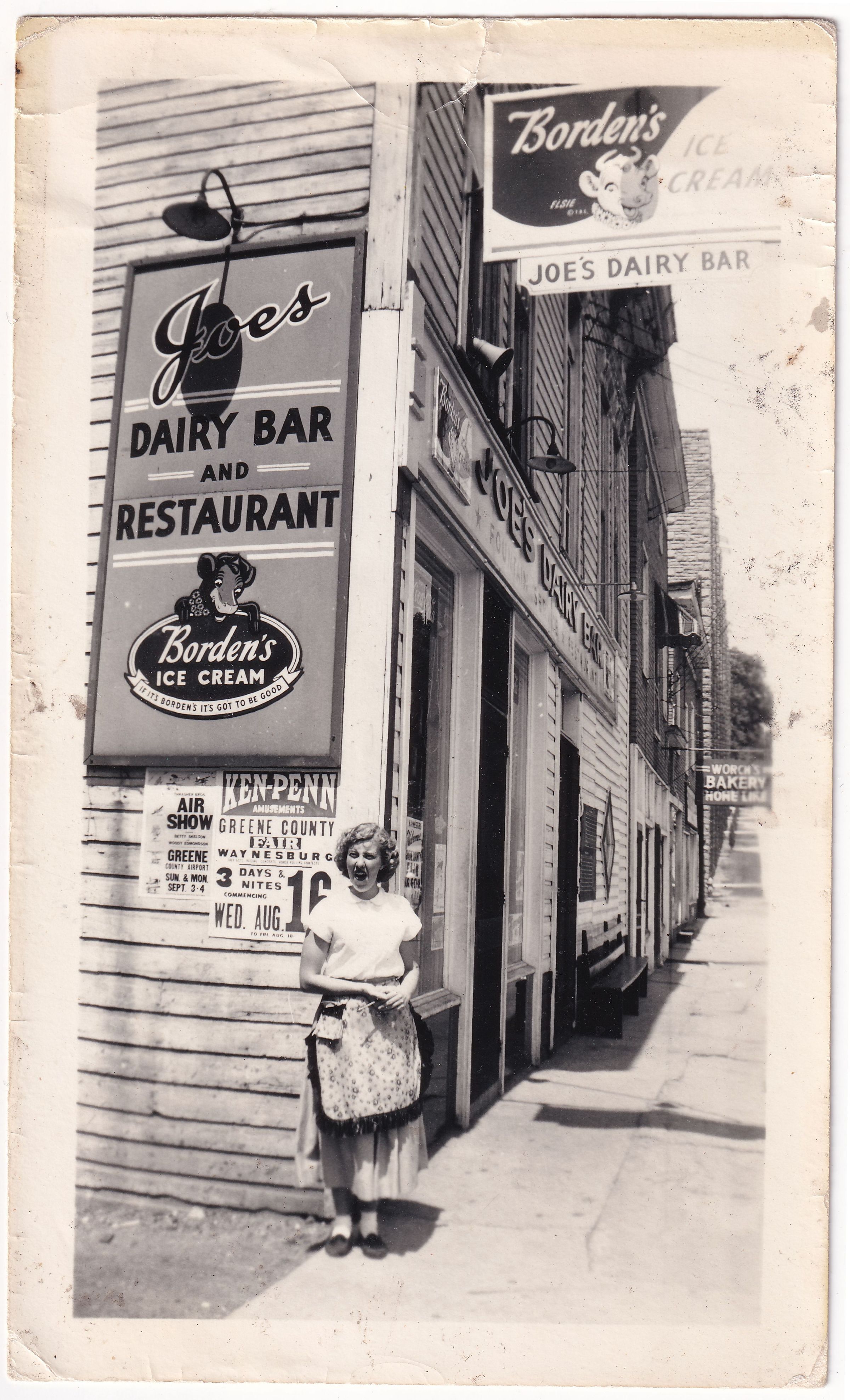 Signs identify Joe's Dairy Bar and Worch's Bakery. Joe's Dairy Bar was opened by Joseph C. Russo in 1946, and sold in 1948, to Joseph F. Komats [1909-1990]. In 1960, a fire destroyed the two frame buildings. See Waynesburg Republican articles: 12 September 1946, page 1, column 3; 15 April 1948, page 1, column 2; and 17 February 1960, page 1, column 1.