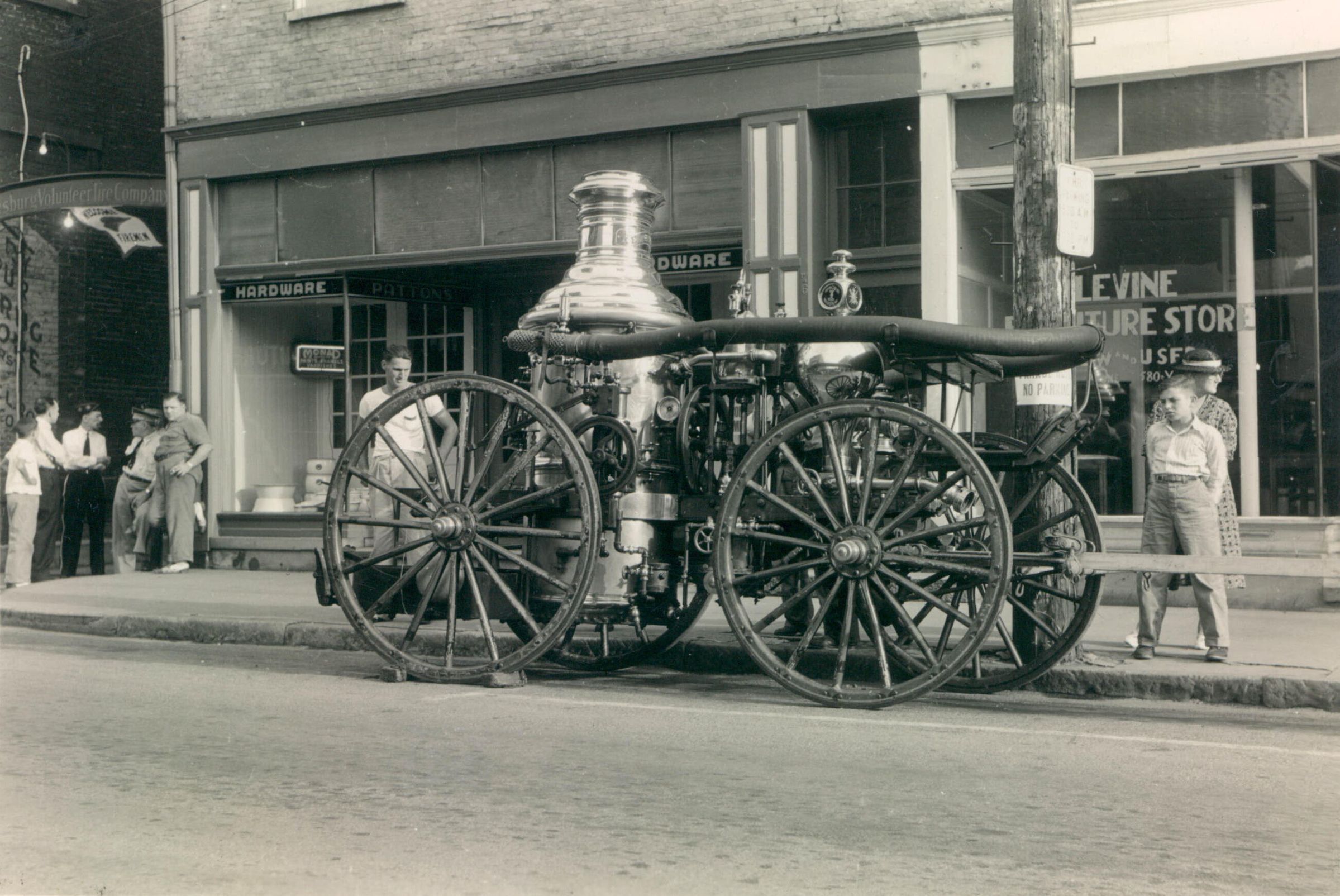 Source Citation: Water pump for firefighting displayed in front of the Levine Furniture Store on High Street in Waynesburg, Pennsylvania; photograph by William E. S. Fletcher; item no. CGSP_AN007_0002, Cornerstone Genealogical Society Collection; Greene Connections Archives Project (GreeneConnections.com).