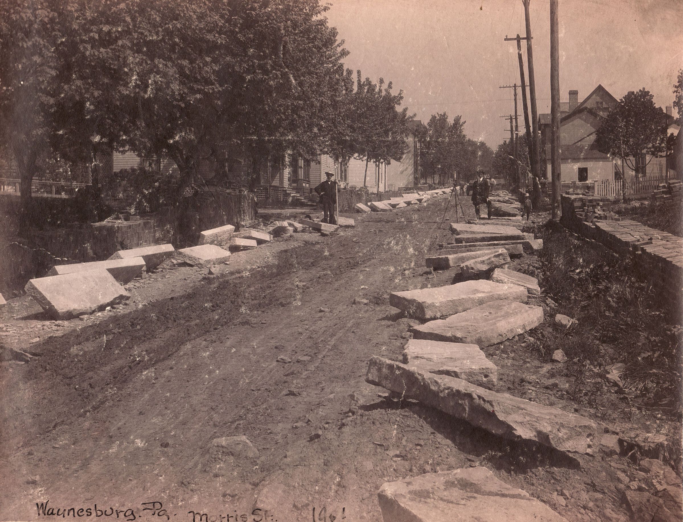 SOURCE CITATION: Waynesburg Album, Photo 01 - Road paving preparation on Morris Street (looking north from First Street toward Elm Street) in Waynesburg, Greene County, Pennsylvania; dated 1901; item no. GCHS-AN031-0001-0001, George David Jenkins Series, Greene County Historical Society Collection; Greene Connections Archives Project (GreeneConnections.com).