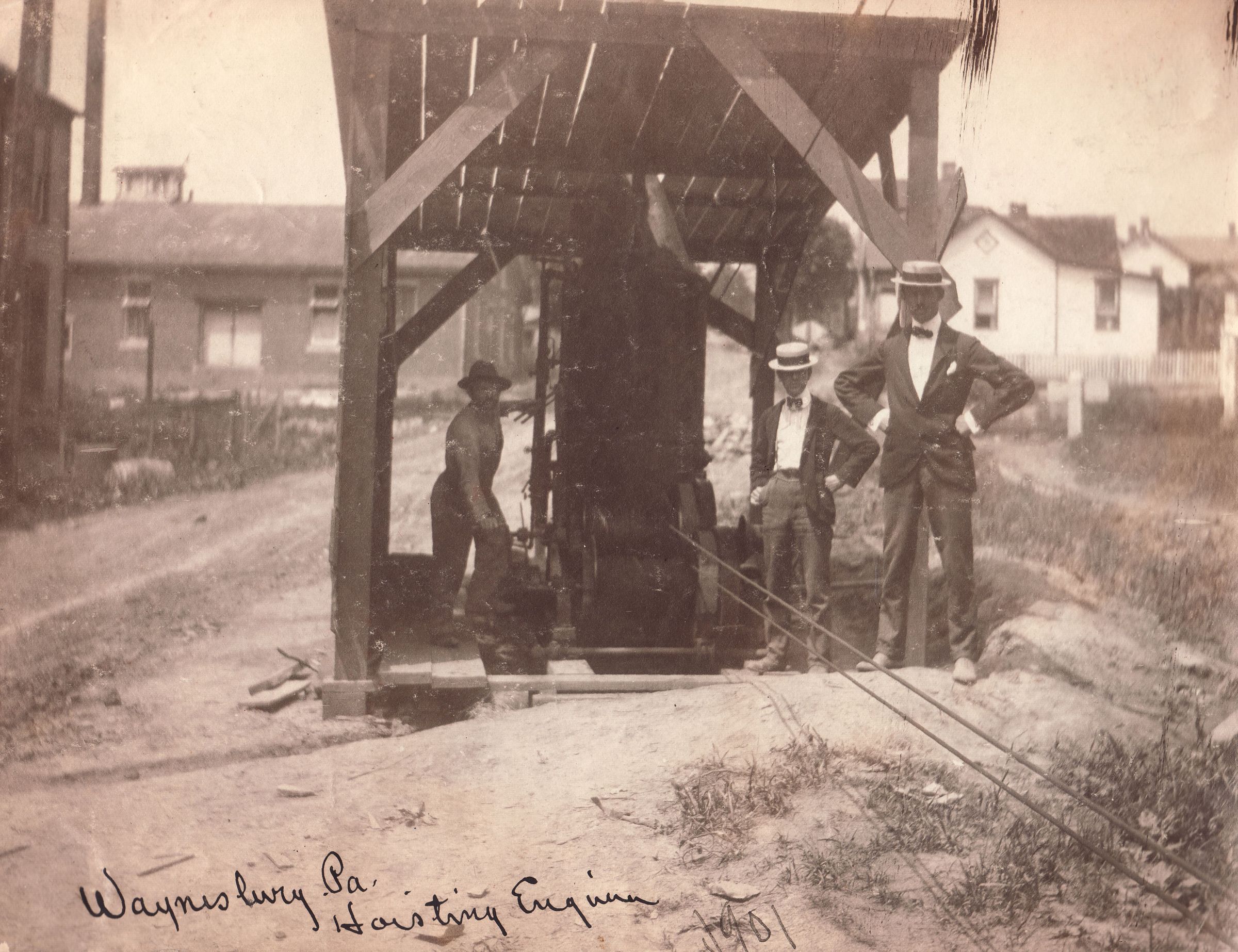 SOURCE CITATION: Waynesburg Album, Photo 04 - Hoisting engineer that powered the pulley system which conveyed the stone from the quarry across Ten Mile Creek on a large steel wire to the stone crusher located at the foot of Morris Street in Waynesburg, Greene County, Pennsylvania; dated 1901; item no. GCHS-AN031-0001-0004, George David Jenkins Series, Greene County Historical Society Collection; Greene Connections Archives Project (GreeneConnections.com).