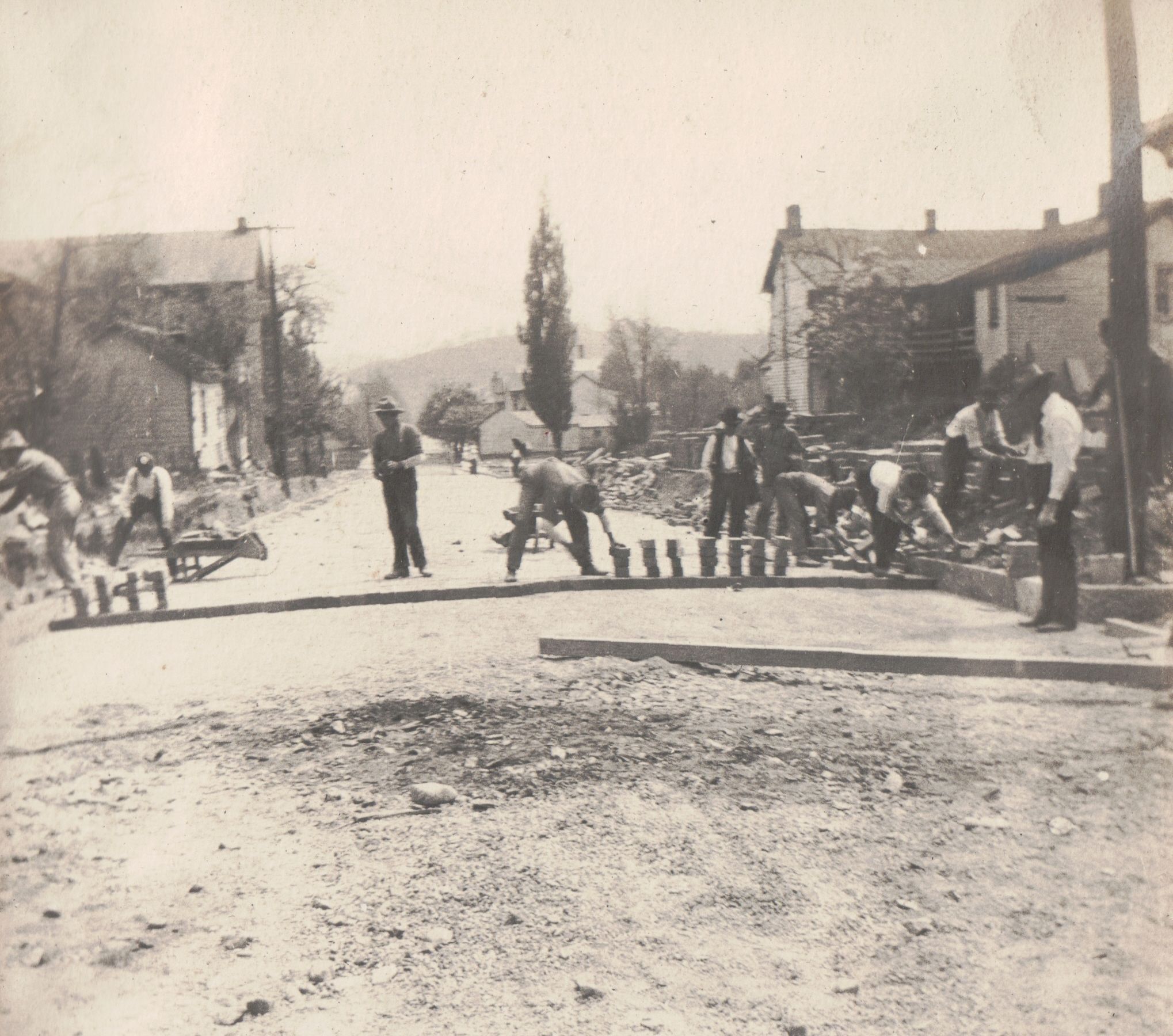 SOURCE CITATION: Waynesburg Album, Photo 11 - Bricks being laid on Richhill Street (looking South) above the Waynesburg College campus in Waynesburg, Greene County, Pennsylvania; dated 1904; item no. GCHS-AN031-0001-0011, George David Jenkins Series, Greene County Historical Society Collection; Greene Connections Archives Project (GreeneConnections.com).