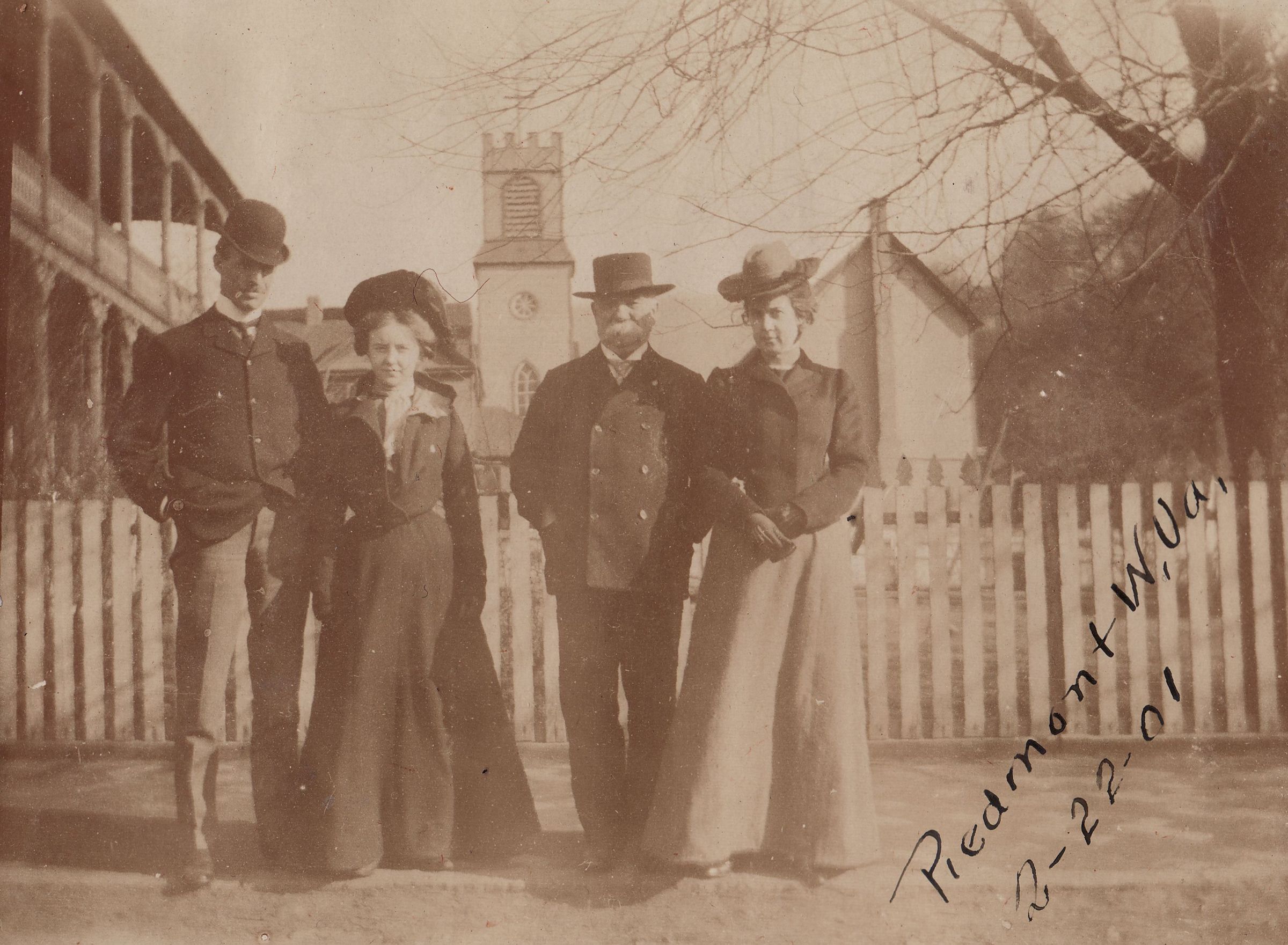 SOURCE CITATION: Waynesburg Album, Photo 14 - [Left-Right]: George David Jenkins [1868-1936], Ethel Johnson, George Harrison [1837-1911], Georgia Johnson; dated 22 February 1901, Piedmont, Mineral County, West Virginia; item no. GCHS-AN031-0001-0014, George David Jenkins Series, Greene County Historical Society Collection; Greene Connections Archives Project (GreeneConnections.com).