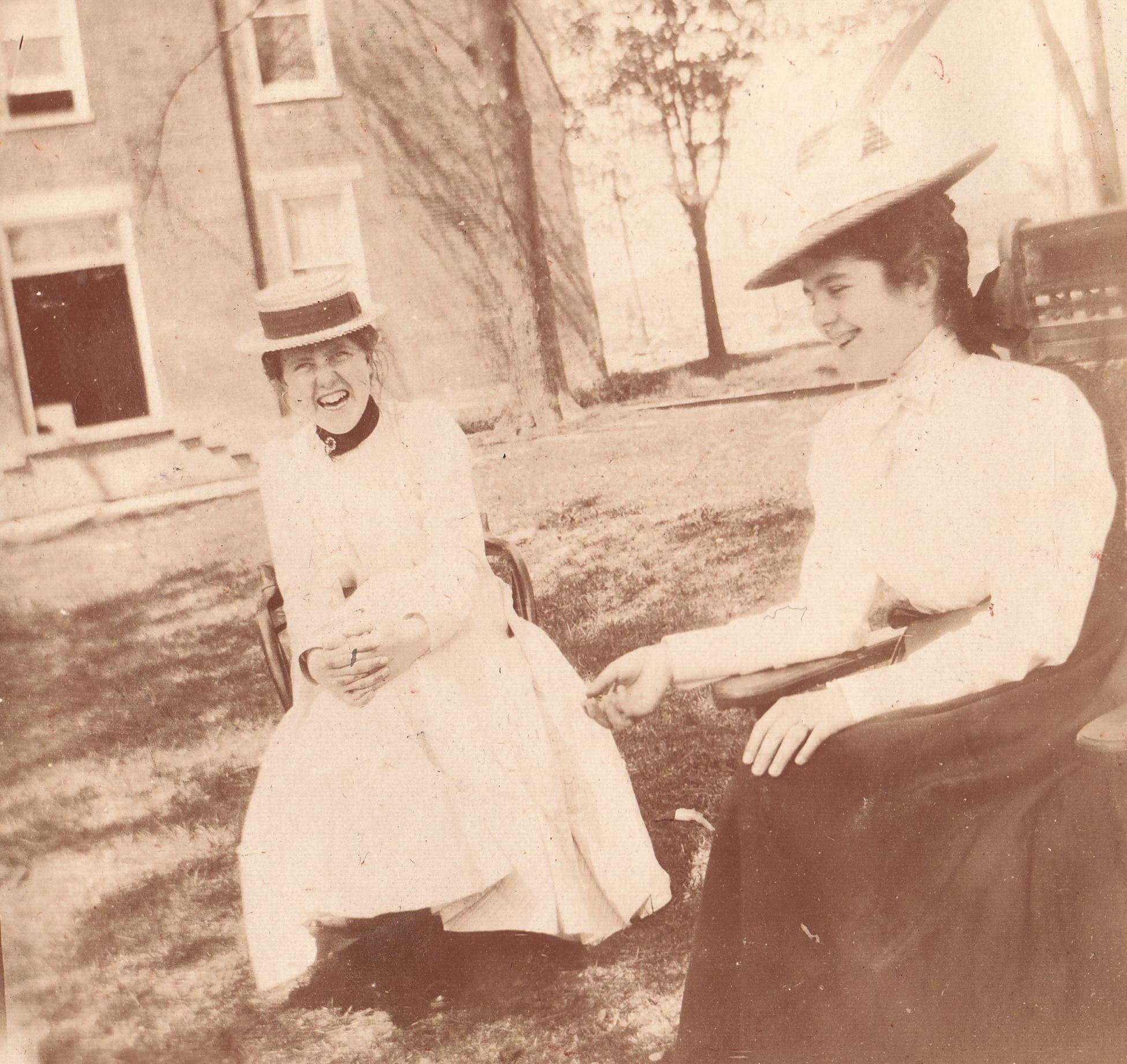 SOURCE CITATION: Waynesburg Album, Photo 19 - [Left-Right]: Margaret Bell "Madge" (Miller) Scott [1883-1963] and Jane Elizabeth (Mealy) Knox [1883-1954] in front of Hanna Hall on the Waynesburg College campus in Waynesburg, Greene County, Pennsylvania; circa 1905; item no. GCHS-AN031-0001-0019, George David Jenkins Series, Greene County Historical Society Collection; Greene Connections Archives Project (GreeneConnections.com).