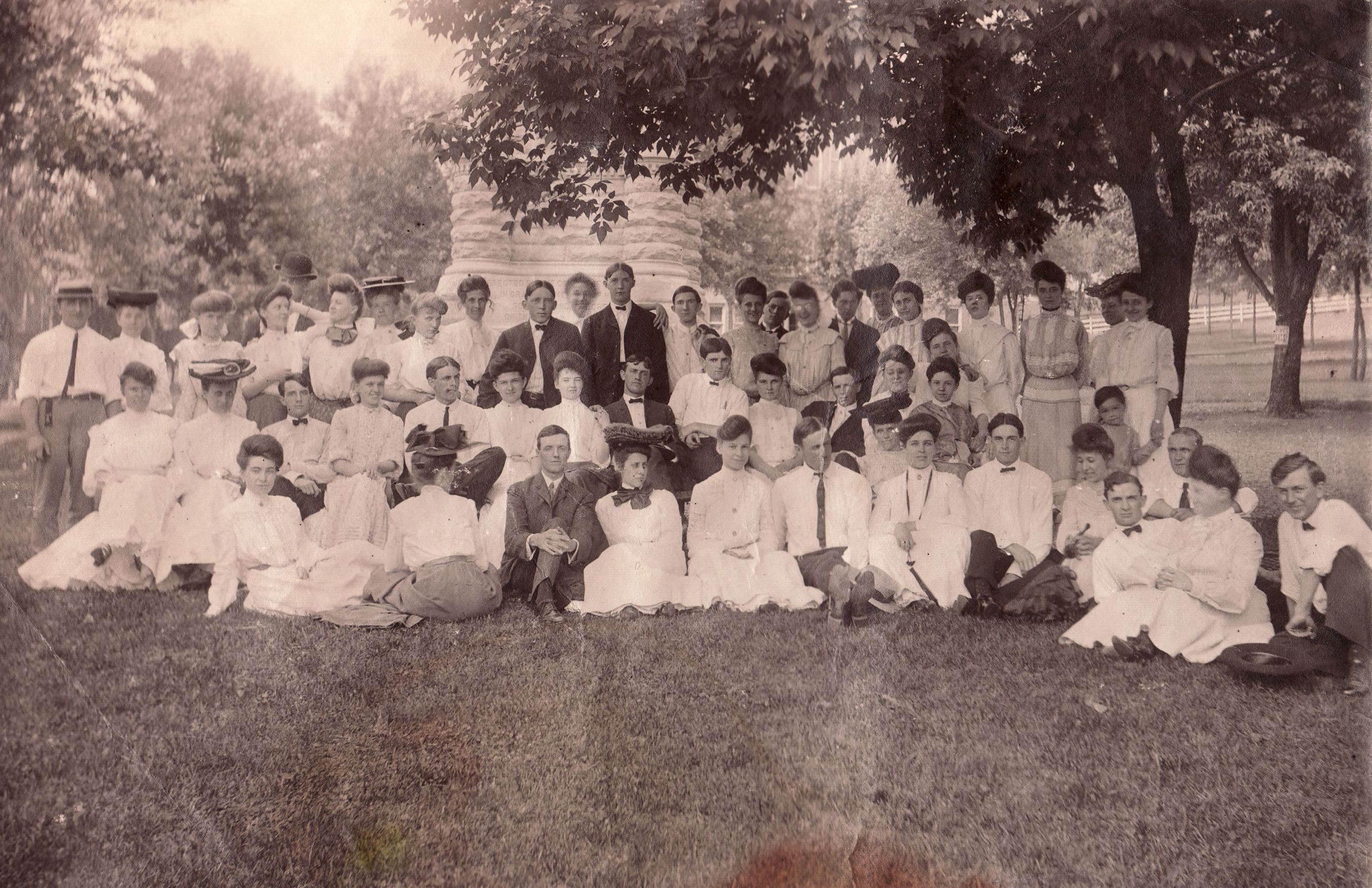 SOURCE CITATION: Waynesburg Album, Photo 25 - Group gathered by the Soldiers & Sailors Monument in Monument Park, Waynesburg, Greene County, Pennsylvania; circa 1905; item no. GCHS-AN031-0001-0025, George David Jenkins Series, Greene County Historical Society Collection; Greene Connections Archives Project (GreeneConnections.com).