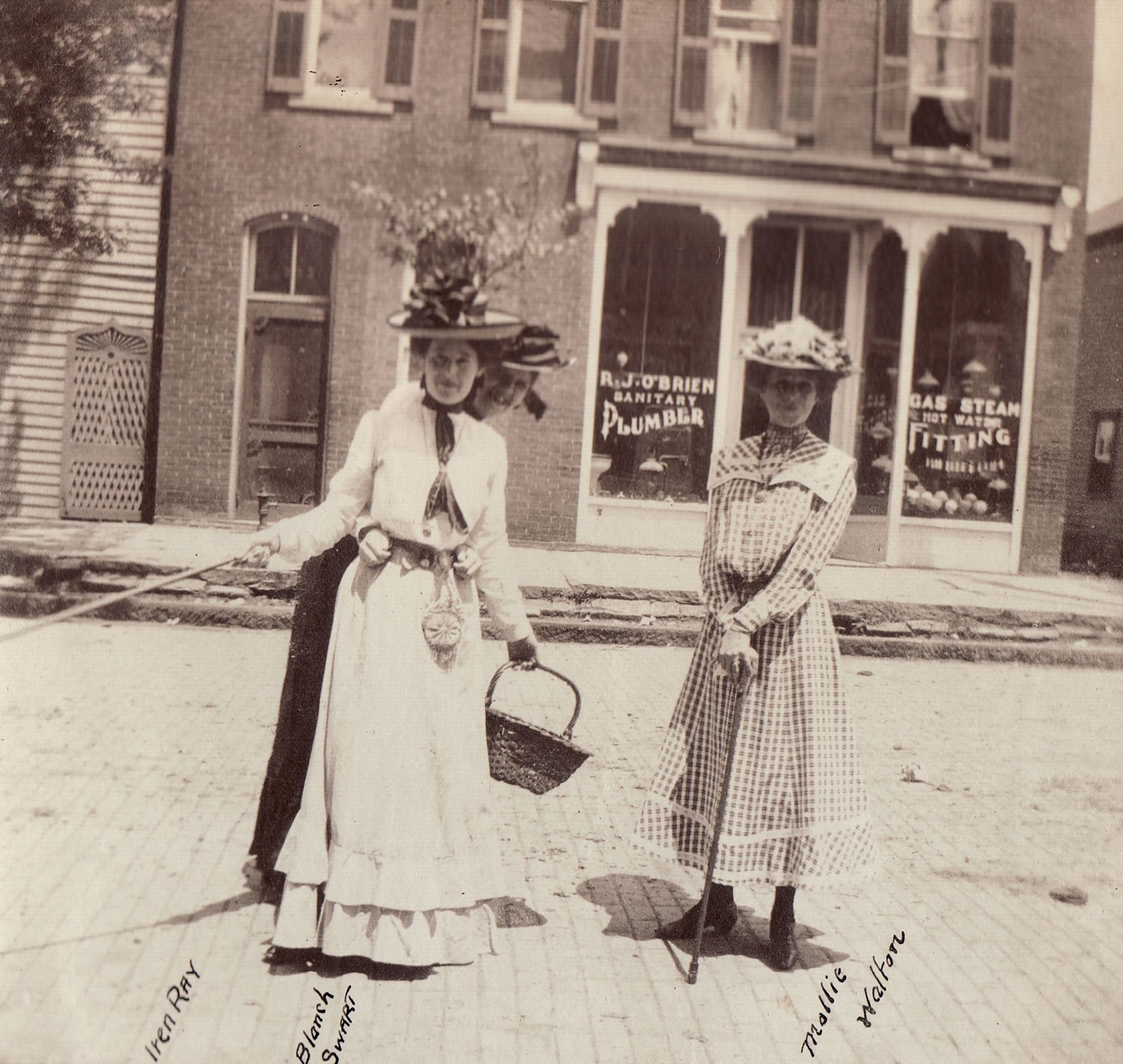 SOURCE CITATION: Waynesburg Album, Photo 31 - [Left-Right]: Irene (Ray) Jenkins [1882-1965] leaning behind Blanche (Swart) Patton [1883-1971], Mary Ann "Mollie" (Walton) (Anderson) (Caperton) Wallace [1886-1973] on High Street in Waynesburg, Greene County, Pennsylvania; circa 1905; item no. GCHS-AN031-0001-0031, George David Jenkins Series, Greene County Historical Society Collection; Greene Connections Archives Project (GreeneConnections.com).
