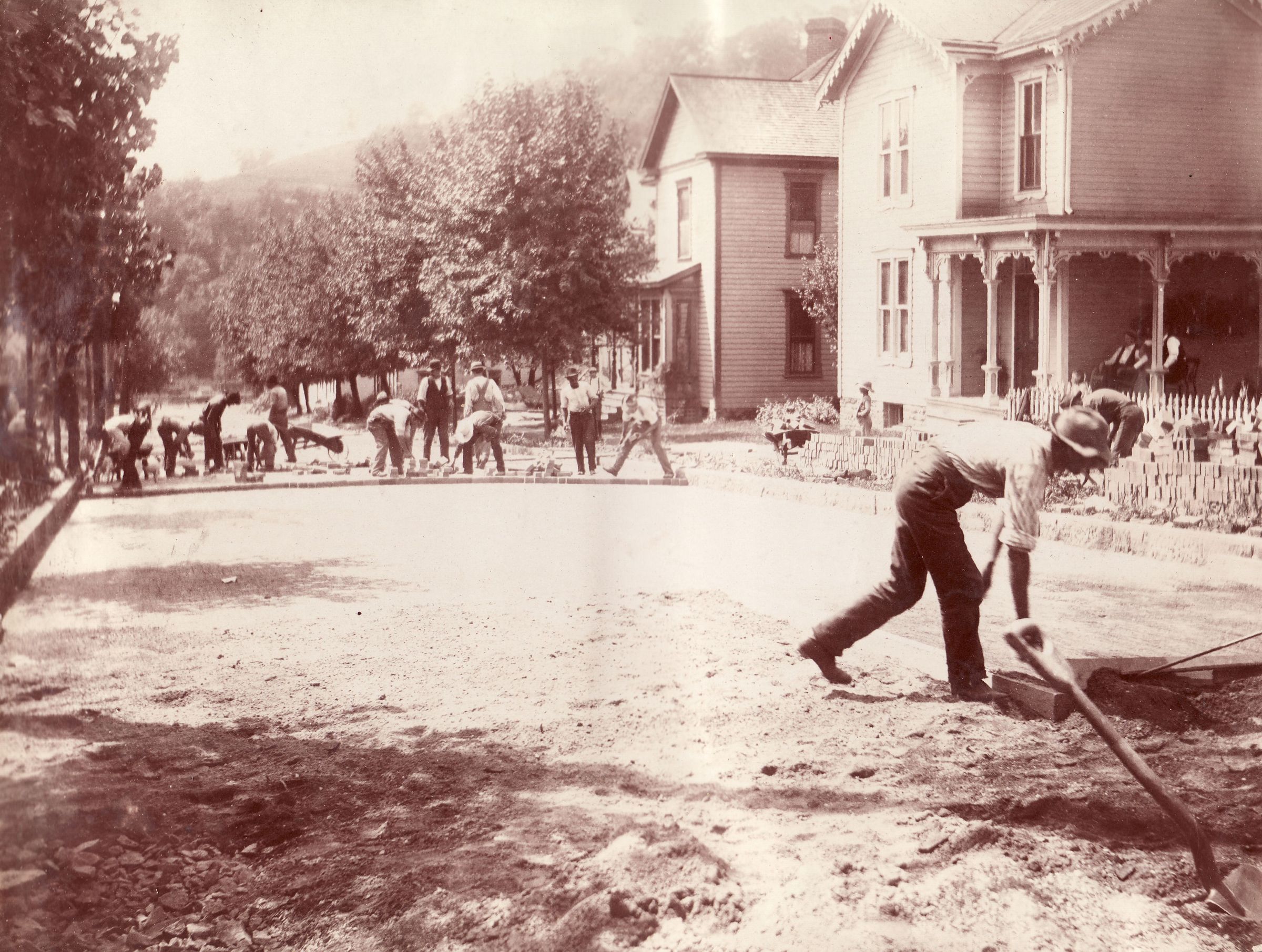 SOURCE CITATION: Waynesburg Album, Photo 38 - Brick road paving in Waynesburg, Greene County, Pennsylvania; dated 1901; item no. GCHS-AN031-0001-0038, George David Jenkins Series, Greene County Historical Society Collection; Greene Connections Archives Project (GreeneConnections.com).