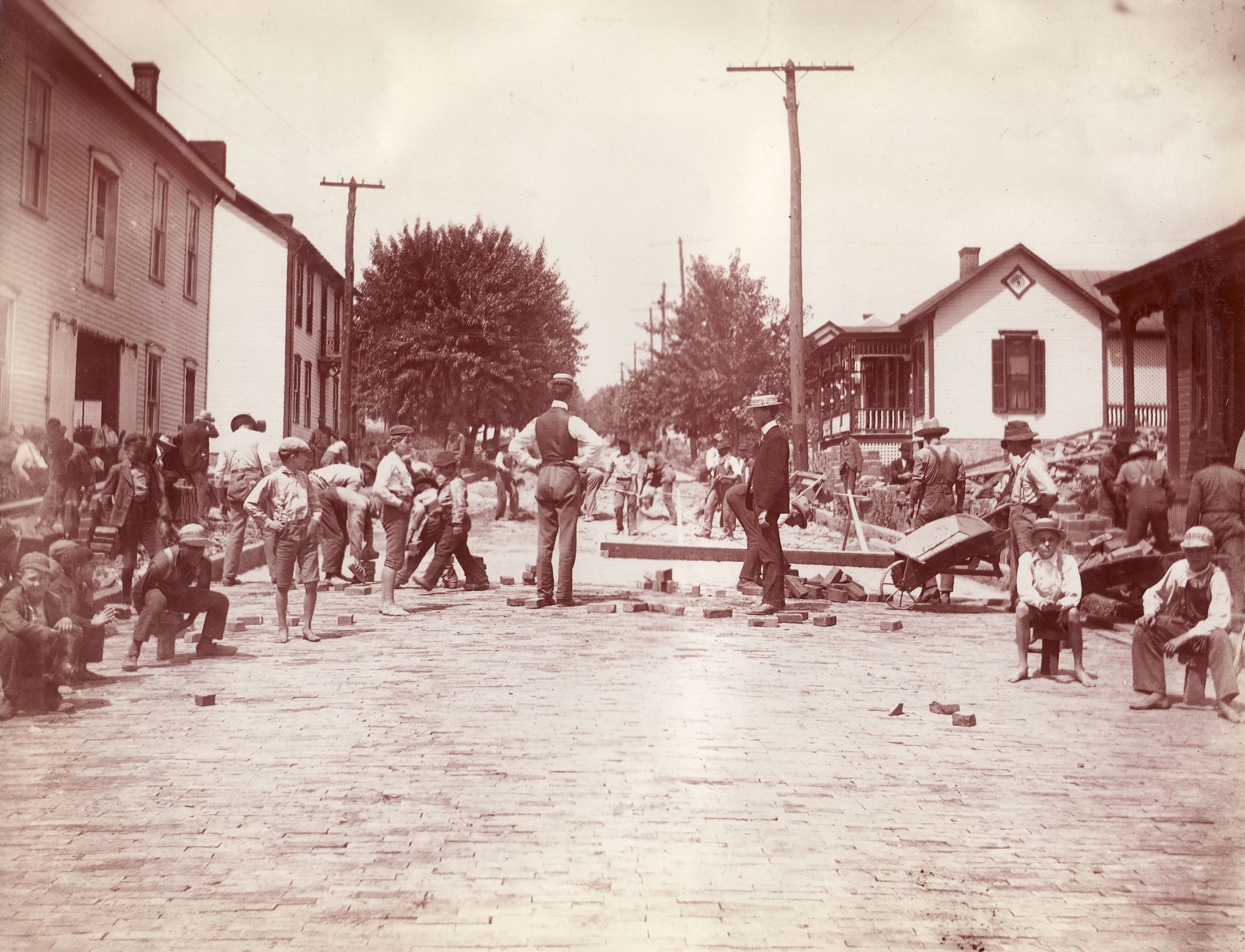 SOURCE CITATION: Waynesburg Album, Photo 40 - Brick road paving on Morris Street (looking north from Lincoln Street toward Greene Street) in Waynesburg, Greene County, Pennsylvania; circa 1901; item no. GCHS-AN031-0001-0040, George David Jenkins Series, Greene County Historical Society Collection; Greene Connections Archives Project (GreeneConnections.com).