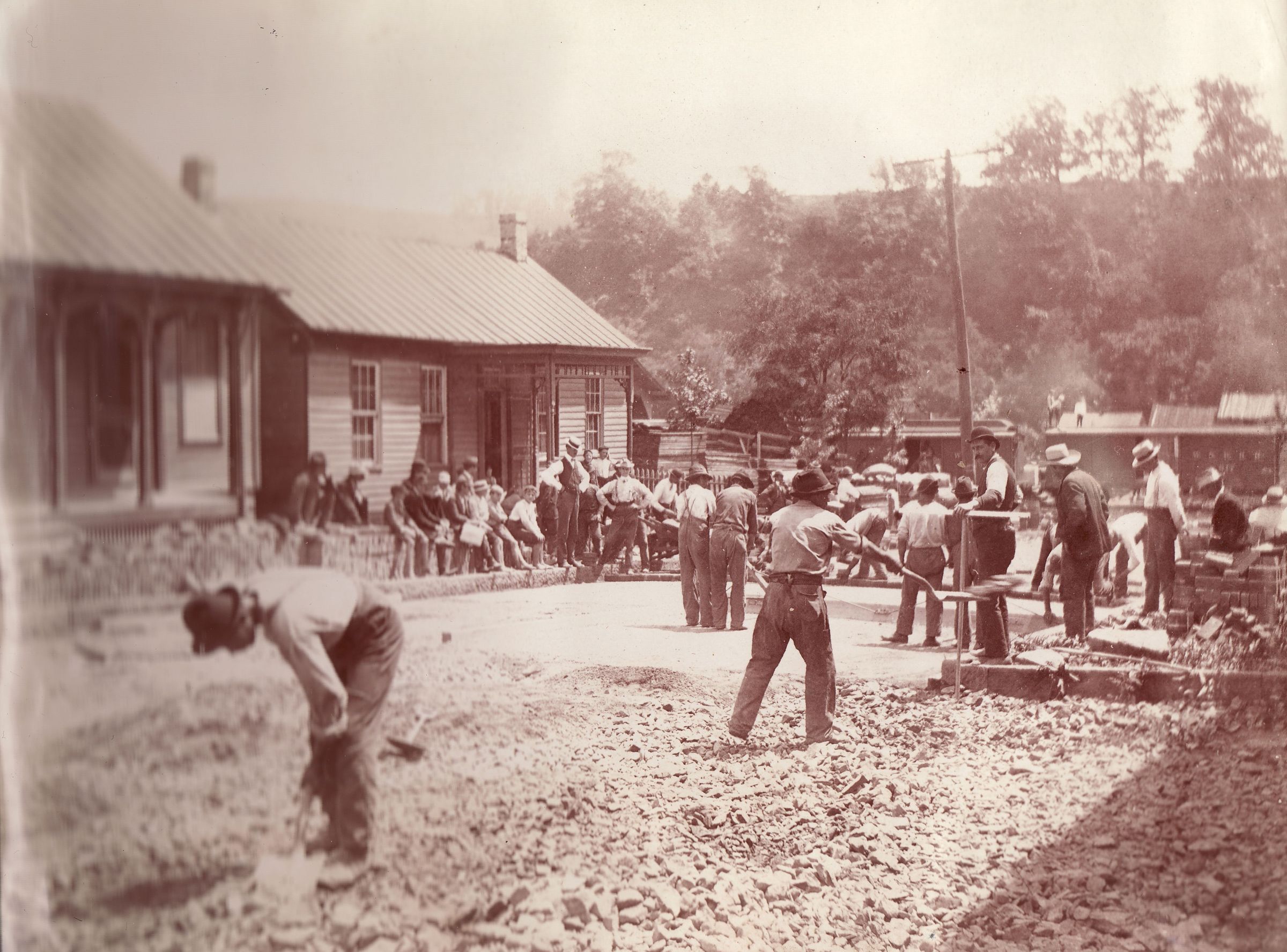 SOURCE CITATION: Waynesburg Album, Photo 41 - Brick road paving preparation on Morris Street, near the Waynesburg & Washington Railroad, in Waynesburg, Greene County, Pennsylvania; circa 1901; item no. GCHS-AN031-0001-0041, George David Jenkins Series, Greene County Historical Society Collection; Greene Connections Archives Project (GreeneConnections.com).