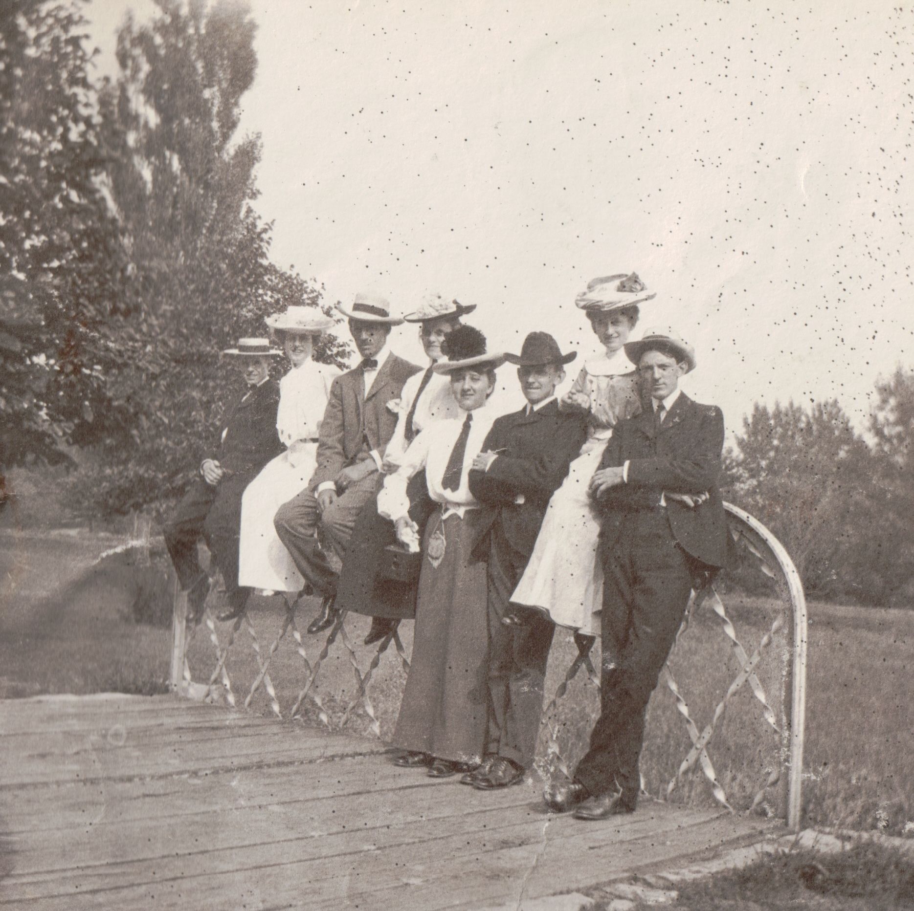 SOURCE CITATION: Waynesburg Album, Photo 43 - Group on bridge in West Park, Waynesburg, Greene County, Pennsylvania; circa 1905; item no. GCHS-AN031-0001-0043, George David Jenkins Series, Greene County Historical Society Collection; Greene Connections Archives Project (GreeneConnections.com).