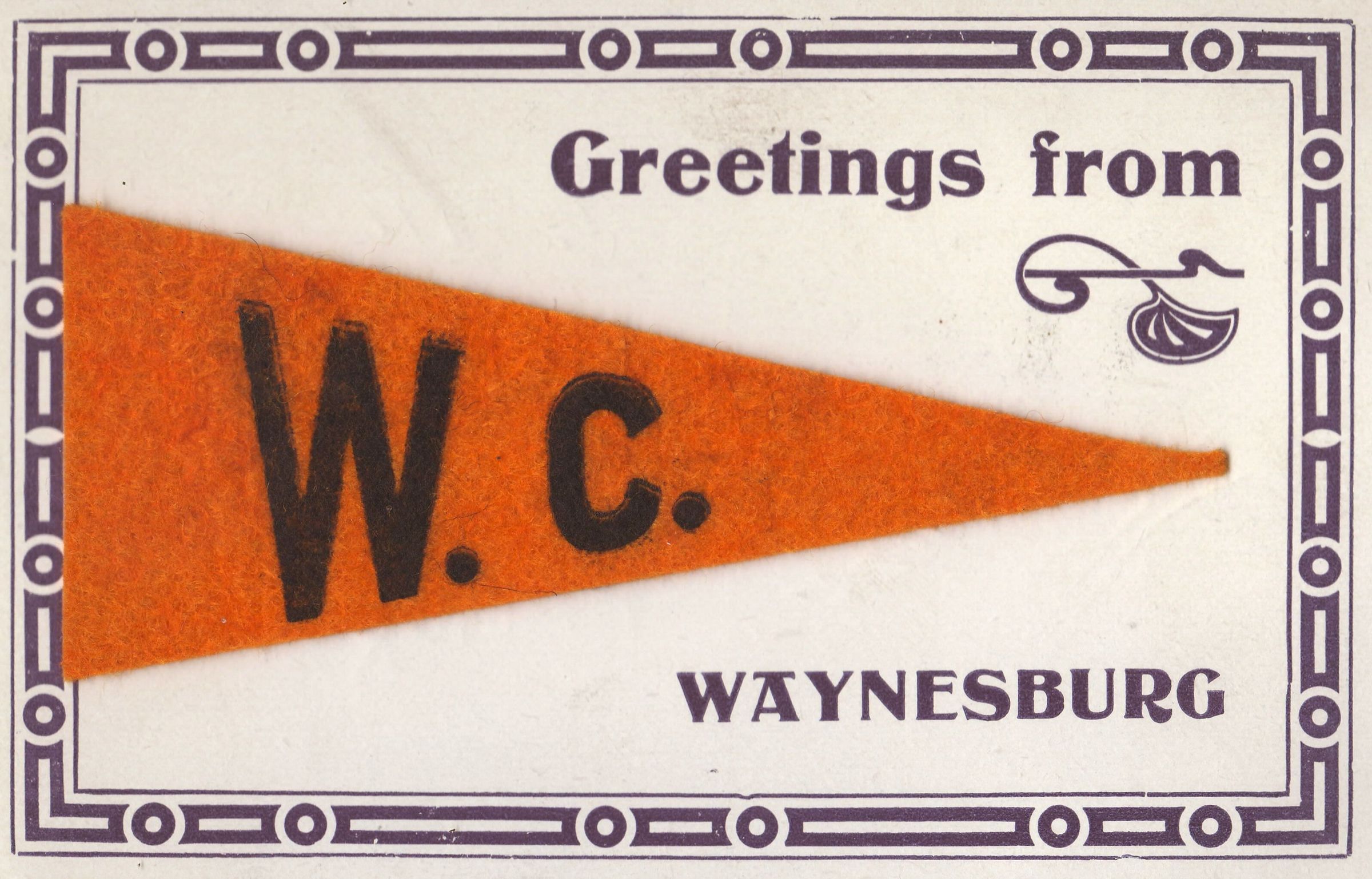 SOURCE CITATION: Postcard greeting from Waynesburg College in Waynesburg, Greene County, Pennsylvania; item no. RUSH-AN001-0013-0076, Walter Markiewich Postcard Collection, shared by Brice and Linda Rush; Greene Connections Archives Project (GreeneConnections.com).