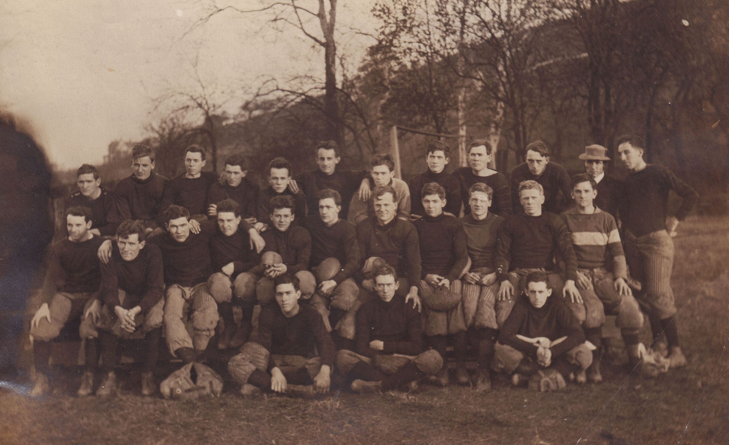 SOURCE CITATION: Waynesburg College Scrapbook, Photo 10 - Waynesburg College football team, 1910; item no. CAND-AN015-0010, scrapbook assembled by Paul Waddell Knox [1891-1965], Waynesburg College, Class of 1913; Candice Lynn Buchanan Collection; Greene Connections Archives Project (GreeneConnections.com).