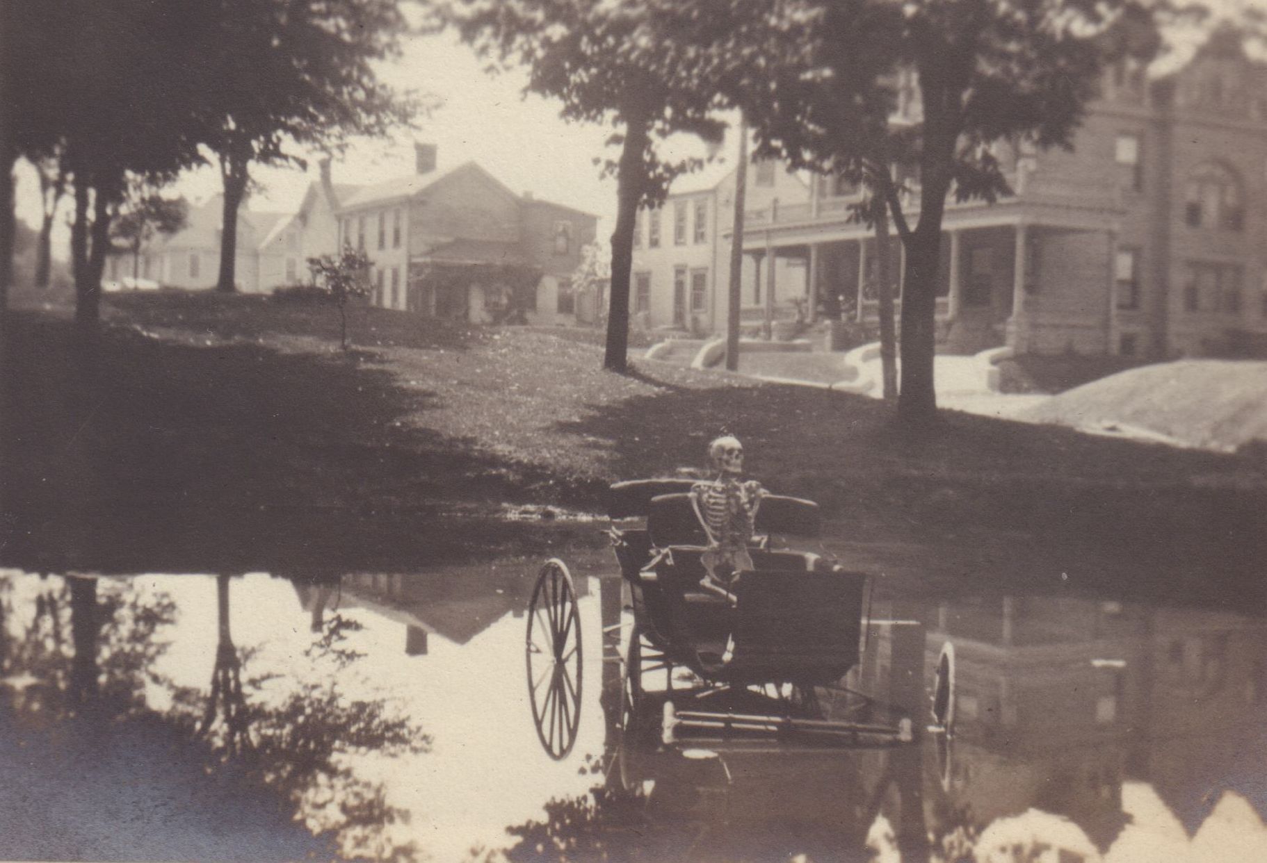 SOURCE CITATION: Waynesburg College Scrapbook, Photo 14 - Skeleton and carriage immersed in the lily pond (a/k/a Lake Winnetta) at College Park, in Waynesburg, Greene County, Pennsylvania, behind which is a view of Wayne Street, featuring the home of Thomas Riley Huffman [1866-1949]; dated May 1911; item no. CAND-AN015-0014, scrapbook assembled by Paul Waddell Knox [1891-1965], Waynesburg College, Class of 1913; Candice Lynn Buchanan Collection; Greene Connections Archives Project (GreeneConnections.com).