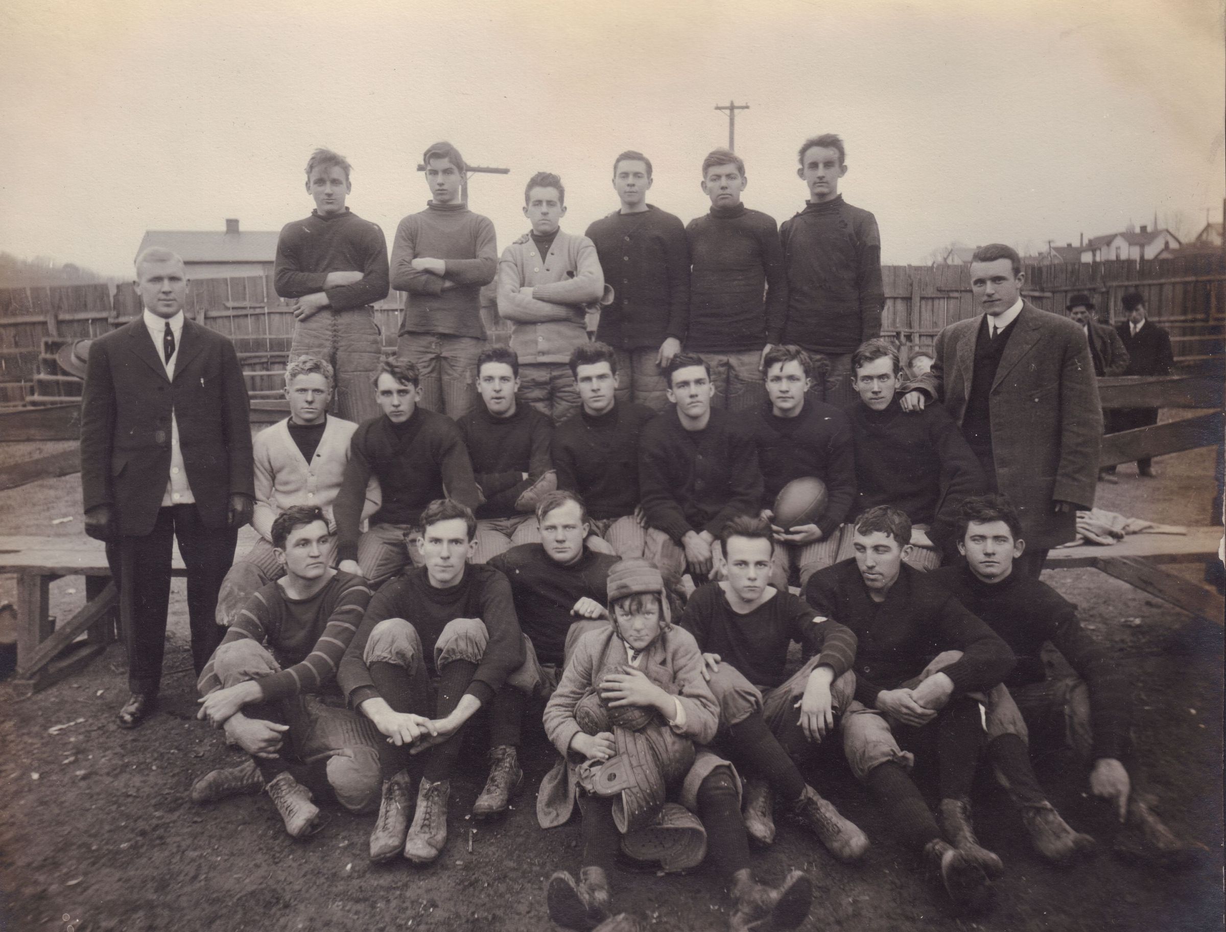 SOURCE CITATION: Waynesburg College Scrapbook, Photo 19 - Waynesburg College football team, 1910; item no. CAND-AN015-0019, scrapbook assembled by Paul Waddell Knox [1891-1965], Waynesburg College, Class of 1913; Candice Lynn Buchanan Collection; Greene Connections Archives Project (GreeneConnections.com).