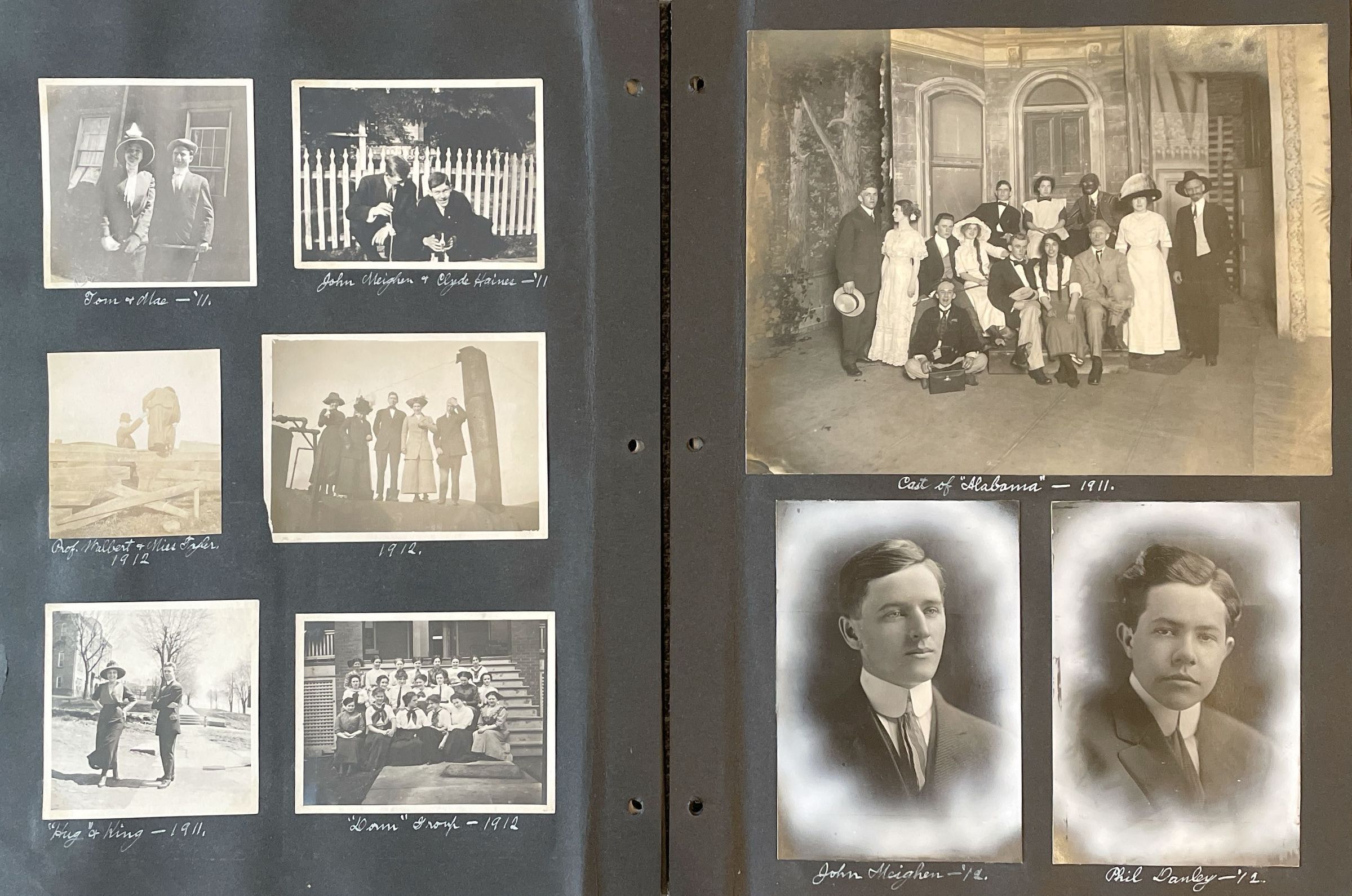 Scrapbook of Waynesburg College memories, 1910-1912, assembled by Paul Waddell Knox [1891-1965], Class of 1913. The album includes 83 images of classmates, friends, sports teams, social groups, and members of Company K, 10th Pennsylvania Volunteer Infantry, National Guard. Paul was the son of a Waynesburg College couple, Isaac Havely Knox (Class of 1889) and Theodosia Burr (Waddell) Knox (Class of 1884), who also appear in their son’s album. The album was acquired via online auction by Candice Buchanan, 2023.