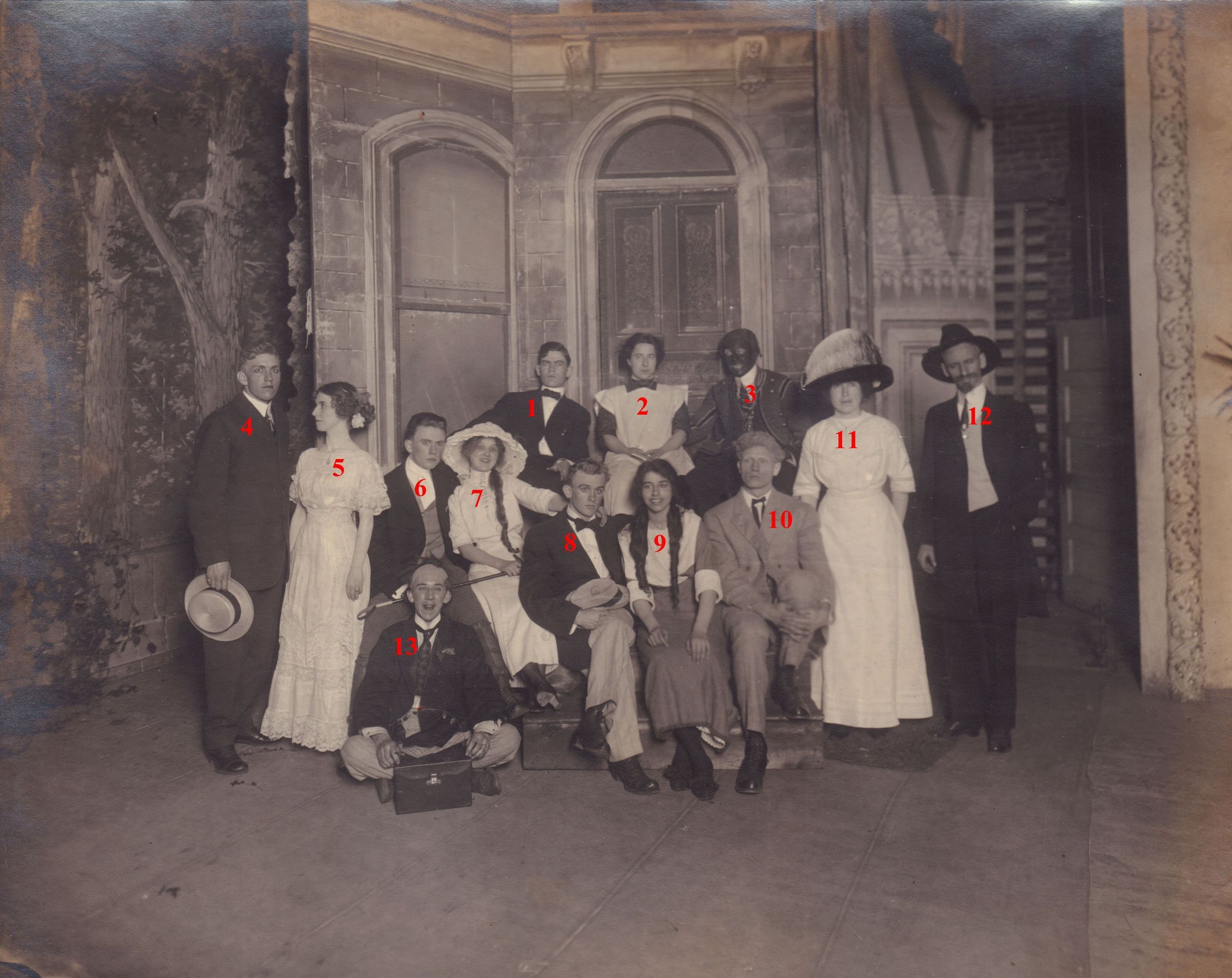 SOURCE CITATION: Waynesburg College Scrapbook, Photo 28 - Waynesburg College students costumed for a theater production of "Alabama," in Waynesburg, Greene County, Pennsylvania; dated 1911; item no. CAND-AN015-0028, scrapbook assembled by Paul Waddell Knox [1891-1965], Waynesburg College, Class of 1913; Candice Lynn Buchanan Collection; Greene Connections Archives Project (GreeneConnections.com).