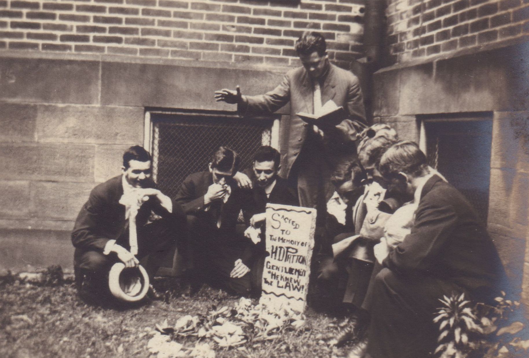 SOURCE CITATION: Waynesburg College Scrapbook, Photo 33 - Mock grave of Henry Dudley Patton [1845-1922], Acting President of Waynesburg College; dated June 1912; item no. CAND-AN015-0033, scrapbook assembled by Paul Waddell Knox [1891-1965], Waynesburg College, Class of 1913; Candice Lynn Buchanan Collection; Greene Connections Archives Project (GreeneConnections.com).